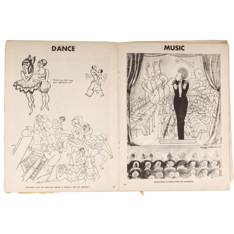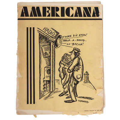 Americana magazine. Vol. 1, No. 1 (Feb. 1932). Cartoons in a number of “themed” sections – finance, politics, fashions, travel, sport, dance, music, etc. 32pp. Covers separate with short margin tears and scuffing.