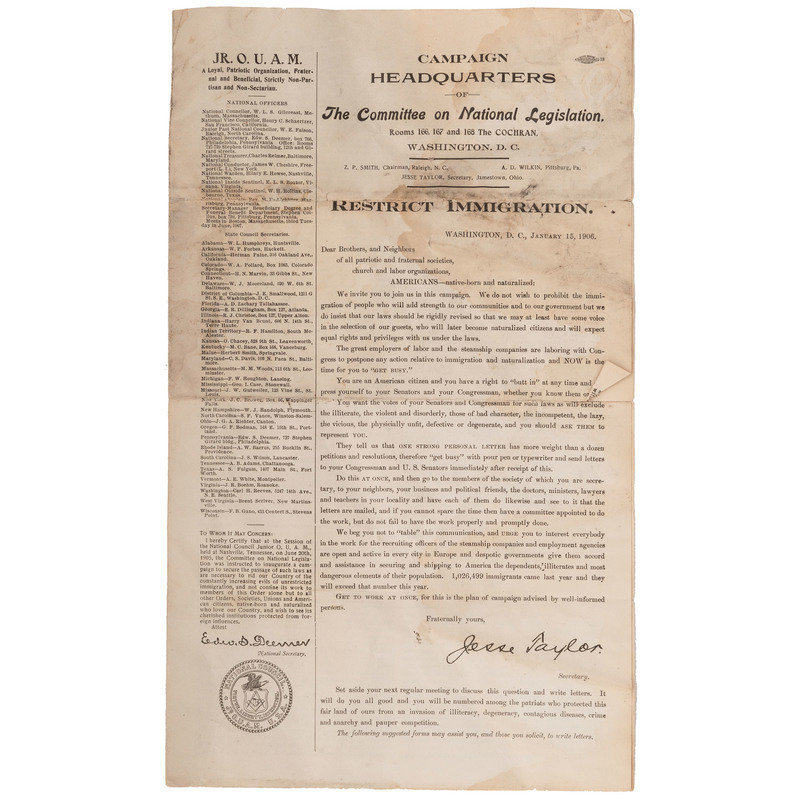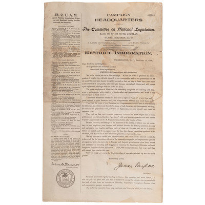 Flier, “Campaign Headquarters of the Committee on National Legislation…. Restrict Immigration, Washington D.C. January 15, 1906.” 4 pages, 9 x 15 in. This was one of the most significant years for immigration policy, giving the federal government ultimate power to select who would and who would not be admitted as a citizen. It also did not eliminate earlier policies that only “white” people could become citizens.