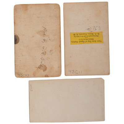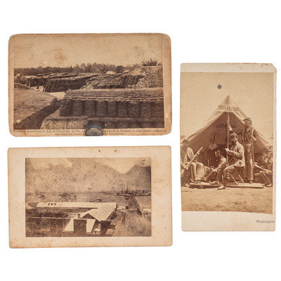 [With:] BRADY, Mathew, photographer. South-West View of Battery No. 1 at Farnhold's House, York River, Yorktown, Virginia. Washington, DC: Barnard & Gibson, [1860s]. 3 5/8 x 2 1/4 in. CDV on cardstock mount (toning, few smudges/spots; dark stain on lower edge of print and mount, edge and corner wear to mount). -- [BRADY, Mathew, photographer]. Soldiers at "Veterans" camp. Washington, DC: n.p., [1860s]. 2 1/4 x 3 3/8 in. CDV on cardstock mount (few spots; image and mount trimmed along left edge).