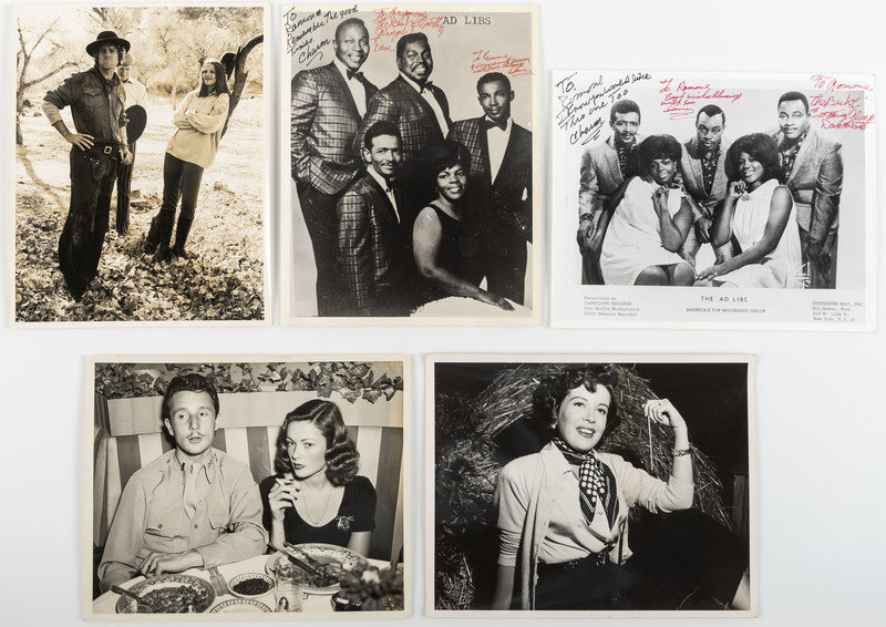 65 photographs, most 5 x 7 to 8 x 10 in, ca 1930s and 1960s. Most seem to be from publishers, about half have labels on verso identifying the people in the images; a few have markings for publication. Identified sitters include: Dolores del Rio; Gene Tierney Gloria de Haven; Carol Lynley; Shirley Booth Shirley Temple; Marion Davies; Anita Louise; Janet Gaynor; Gene Raymond; John Howard; Jean Stevens; Margaret Johnson; Valerie James; Marianne Richards; Marilyne Towne; Gloria Haupt; Floria (of Mario & Floria); Barbara Lawrence; Zita Miller; Korky Kelly; Helmut Dantine; Gwen Walton; Monica Moore; Ryan O'Neal; Leigh Taylor-Young; Marlene Dietrich; George Temple, two photos of Elizabeth (Windsor), future Queen of England, and her sister, Margaret as children (in one they wear kilts and are feeding dogs) and singing group the Ad Libs, two photos (ca 1965 and 1967) each signed by three members of the group.