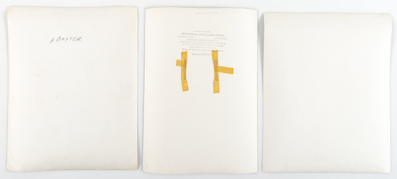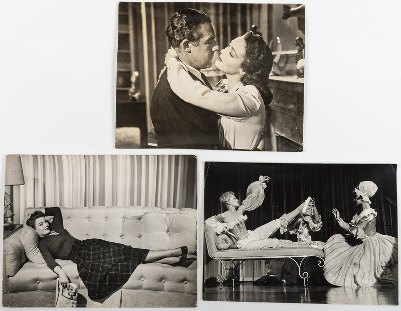 [With:] 24 promotional photographs of Hollywood stars, ca 1940s and 1950s. Studios represented are 20th Century Fox, MGM, and Columbia, including: 5 photos of actress Anne Baxter (1925-1985), from 10 x 13 in. to 11 x 14 in. -- 3 photos, approx. 11 x 14 in., of actress Jeanne Crain (1925-2003), one with Lan McCallester. -- 11 x 14 in. photograph of actress Loretta Young (1913-2000). With printer's markings. -- 10 x 13 in. photograph of actress Jeanette MacDonald (1903-1965) with Lew Ayres [MGM]. -- 10 x 13 in. photograph of actress Janet Leigh (1927-2004). -- 2 photos, approx. 11 x 14 in. of actress Linda Darnell (1923-1965), with printer's markings, plus one unidentified photo that seems to also be Darnell. Third has the same printer's markings as one of the Darnell photographs.-- 8 photos, approx. 10 x 13 in. Publicity stills for Pal Joey, Columbia Pictures, 1957. Images were circulated for advertising, and two still have their negatives taped to verso. Several others with tape remnants, but the negatives are missing.
