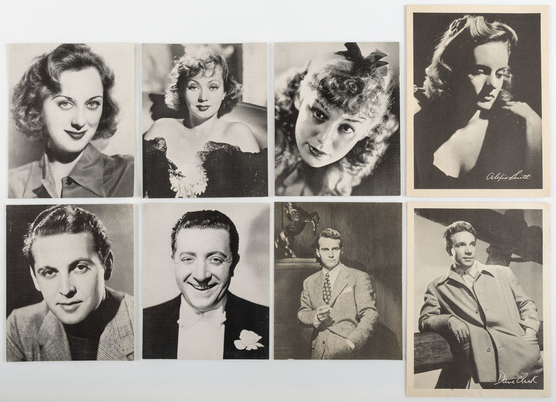 40 promotional photographs, most 8 x 10 in. or smaller, ca 1930s-1950s. Identified individuals with picture, if known, include: Bob Hope ("Thanks for the Memories"); Alexis Smith ("Night and Day"); Henry Fonda; Helmut Dantine ("Shadow of a Woman"); Florence Rice; Rochelle Hudson ("Show Them No Mercy"); Zasu Pitts (Riddle of Dangling Pearl"); Madeleine Carroll ("The General Died at Dawn"); Ruth Chatterlon; Lyle Talbot ("Go West Young Man"); Dennis Morgan ("The Time, the Place, and the Girl"); Dane Clark ("Her Kind of Man"); Bob Walker ("Her Highness and the Bellboy"); Otto Kruger; The Ritz Brothers ("Yours for laughs"); Buddy Rogers; Michael Whalen ("Career Woman"); Eddie Cantor; Ronald Coleman; Madeleine Carroll; Robert Donat; Martha Raye ("College Holiday")'; Mario Lanza ("The Great Caruso"); Spencer Tracy; Jessie Matthews ("Paris Love Song"); Myrna Loy; Ralph Bellamy ("Navy Wife"); Ava Gardner (in color).