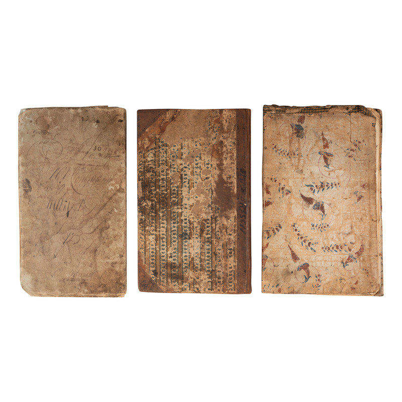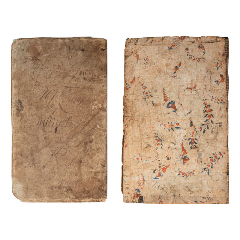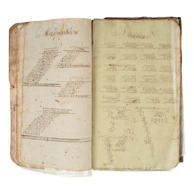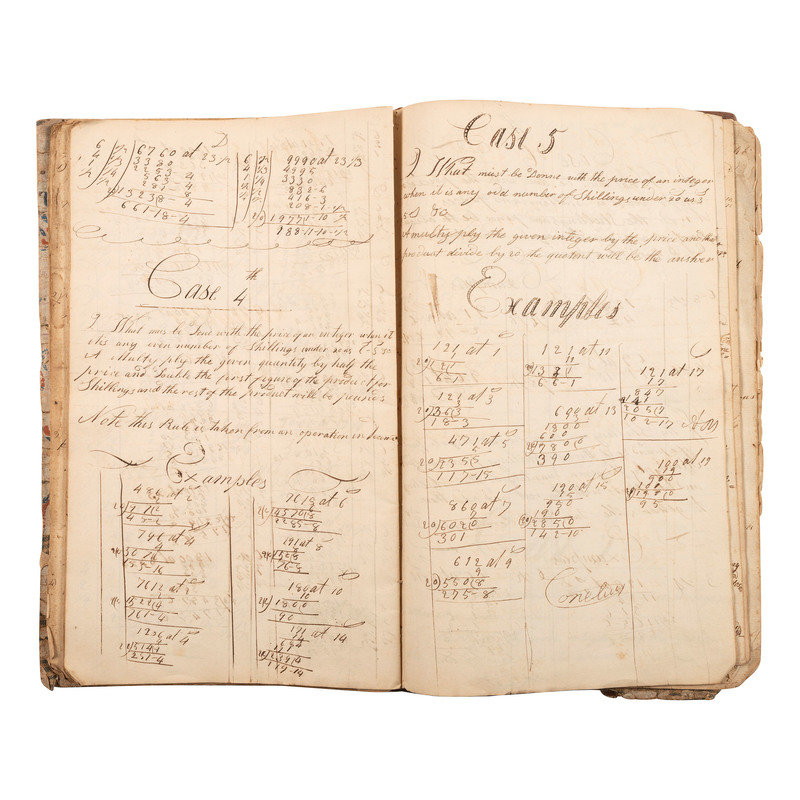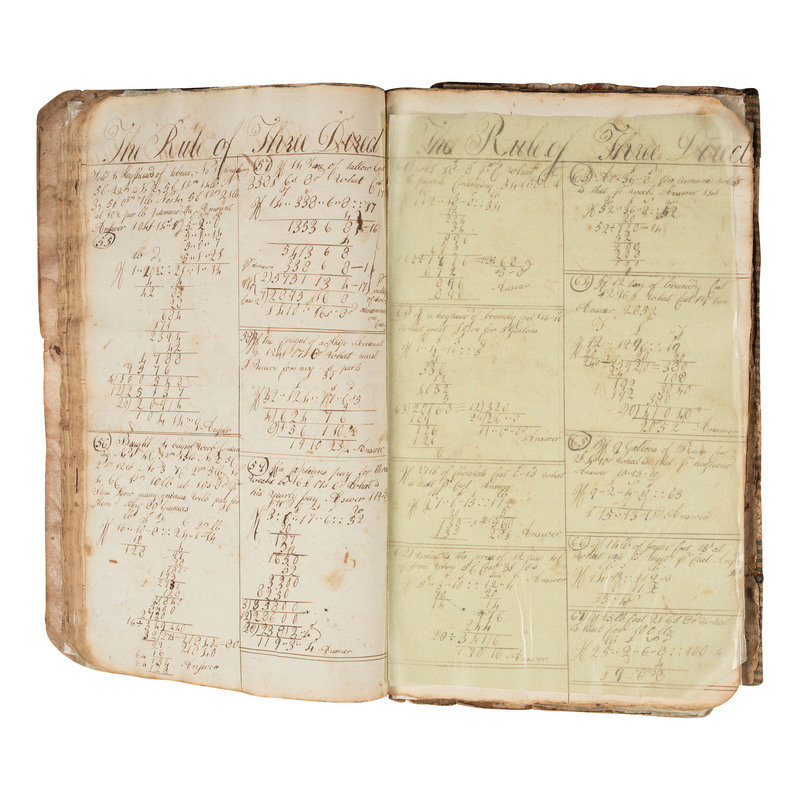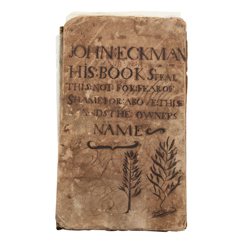 [With:] Pair of workbooks of John Eckman. N.p., n.d. Folio, 8 1/4 x 13 1/4 in. Paper-bound ledgers (moderate wear); all books housed in custom cloth clamshell. Completed in manuscript (some loose gatherings). Provenance: John Eckman (ownership documentation on cover). The books seem to be those of an apprentice with several "cases," notes, tables of measurement, and mathematics practice. The back cover of one of the ledger reads: "John Eckman, His Book Steal This Not for Fear of Shame for Above This The Owners Name."
