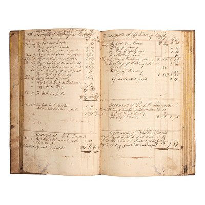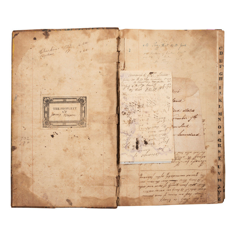Account book of William and James Bryson (Brison). [Pennsylvania], 1832-1870. Folio, 7 3/4 x 12 1/2 in., 220pp. manuscript ledger (24 pages of preliminary material, 196 pages of accounts), interleaved with small paper scraps with receipts, figuring, etc. (Toned, occasional spotting). Quarter leather bound with printed paper boards ledger (heavy wear to paper, some staining). Provenance: James Brison (bookplate); William Bryson (note reading: "William Bryson's Book. A Native of Ireland arrived in the United States of America November 7th in the year of our Lord One thousand Seven hundred and Eighty three.")