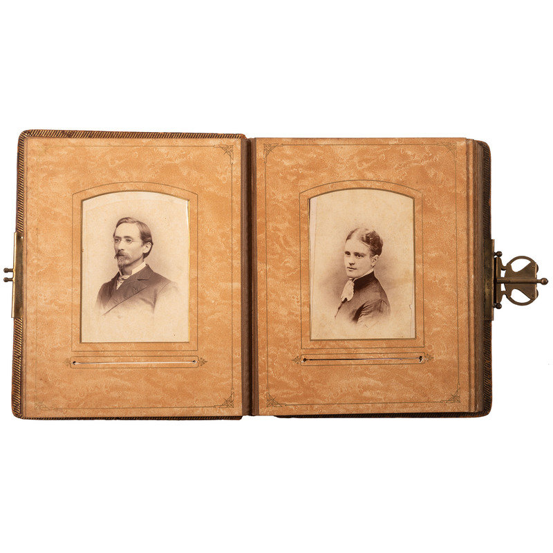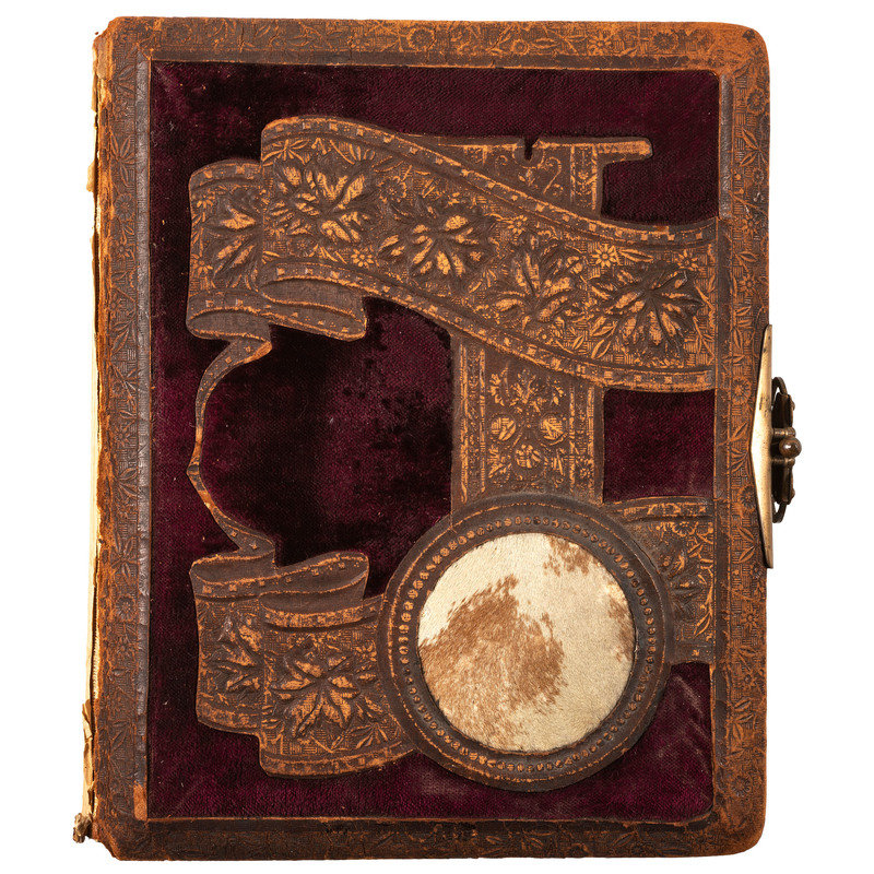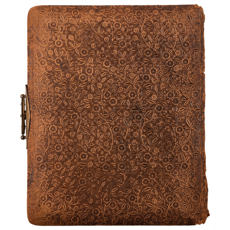 Photo album, 8.5 x 10.5 in. Embossed leather over velvet, disk missing from front, clasp intact, slightly cocked. Contains 12 cabinet cards, most of the photographers were working in Manchester, Ohio, Jackson, OH, Georgetown, OH, Peoria, IL and Des Moines, IA. There are also two cdvs, although there is room for more.