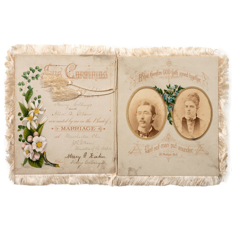 Marriage certificate for Henry Collings and Alice B. Gibson, with cdvs of each on front. Mary Kirker and Mary Collings signed as witnesses.