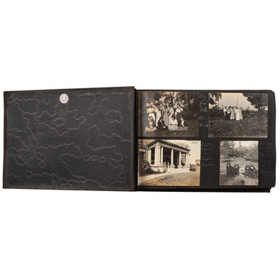 Photograph album: (obl. 7 x 11 in., black, string-tied spine) 192 photos, 5 x 7 in. to 2 x 3 in.