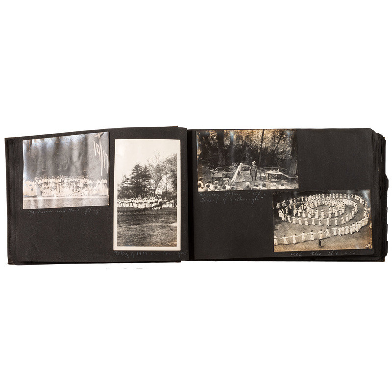 Photo album, obl. 7 x 11 in., string-tied spine. 192 photos from 2.5 x 4 to 5 x 7 in., most dated 1920. A second album, nearly identical but with more pages, has 382 photos, 1914-1926.