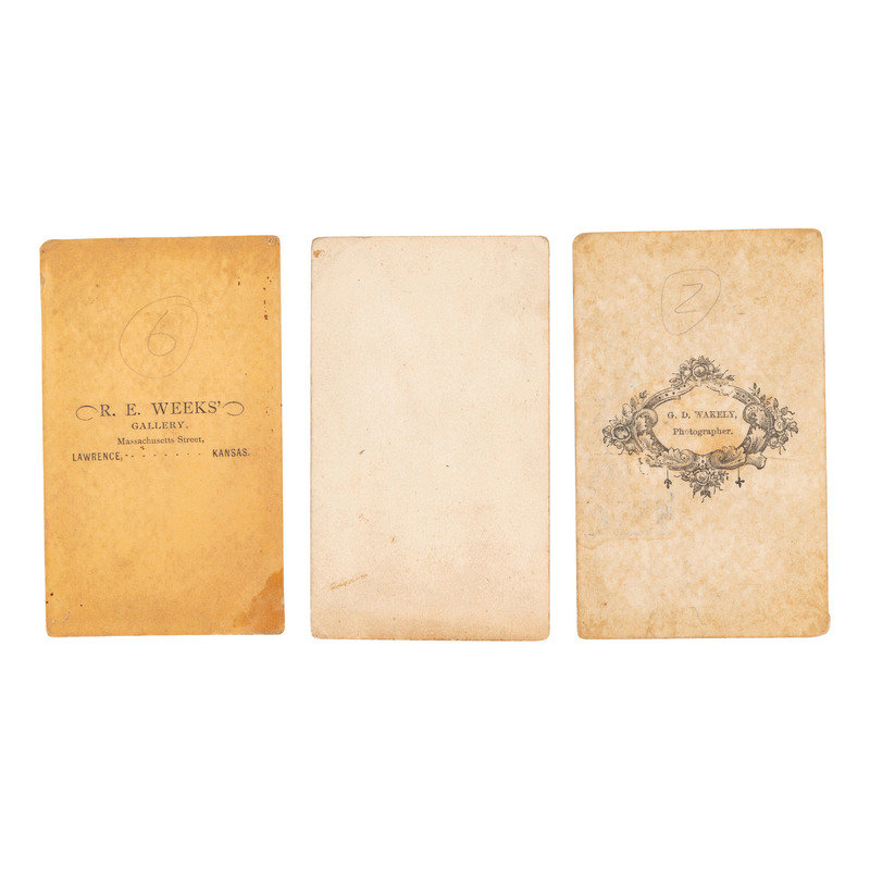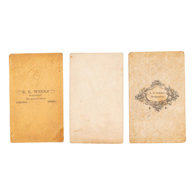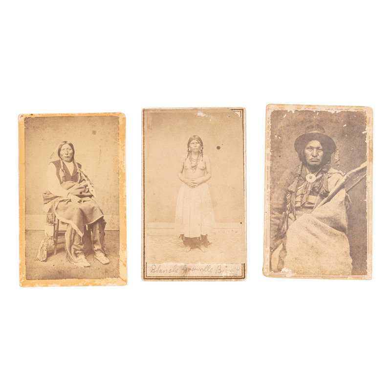 Studio portrait of Blanche Grannelle Bigney(?). N.p.: N.p., n.d. Pencil inscription to recto identifies the subject. The female subject wears a skirt and necklaces, her hair in braids and her breasts bare. -- WEEKS, R.E., photographer. Studio portrait of a seated Native American man. Lawrence, KS: R.E. Weeks, n.d. Photographer's imprint to verso. -- WAKELY, G.D., photographer. Studio portrait of a seated Native American man wearing a hat and holding a rifle. [Washington, DC]: G.D. Wakely, n.d. Photographer's imprint to verso. -- Together, 3 CDVs on cardstock mounts, approximately 2 1/8 x 3 1/2 in., condition generally good, some toning, occasional chipping to edges.