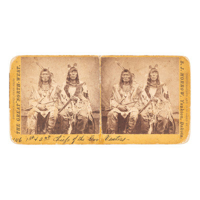 7 x 3 1/2 in. stereoview (previously split vertically at center of mat and repaired, toning, spotting, edge and corner wear to mount, penciled notes on verso). Photographer's imprint, photograph title, "146 1st & 2nd Chiefs of the Gros Ventres," and series title, "The Great North-West" on mount recto.