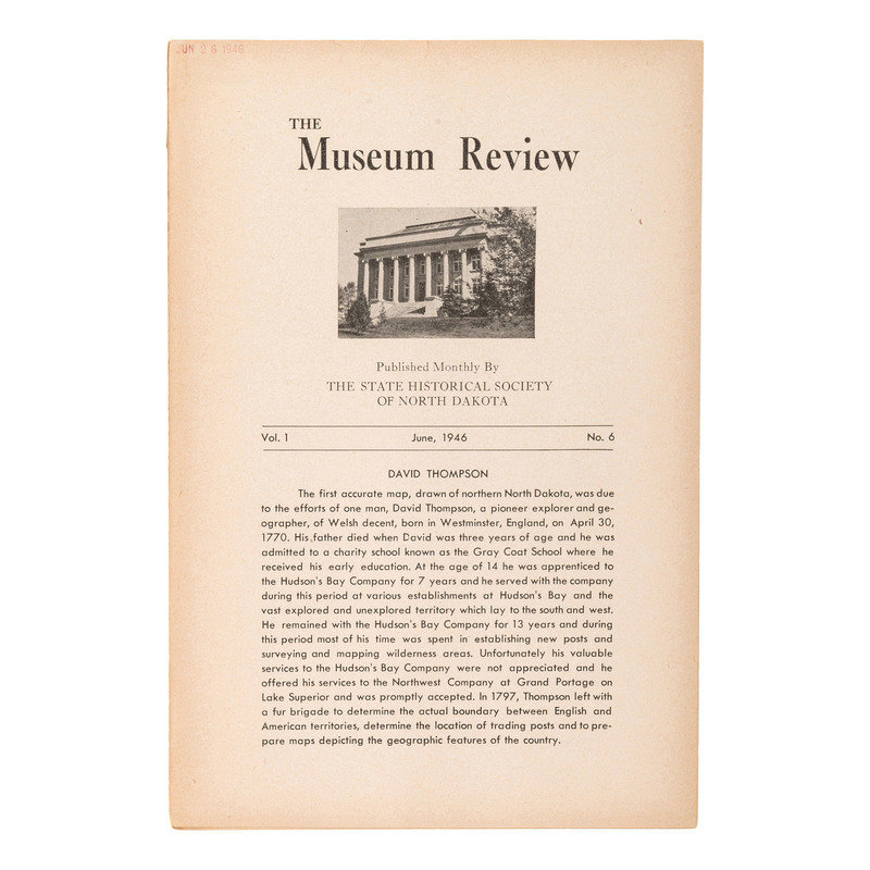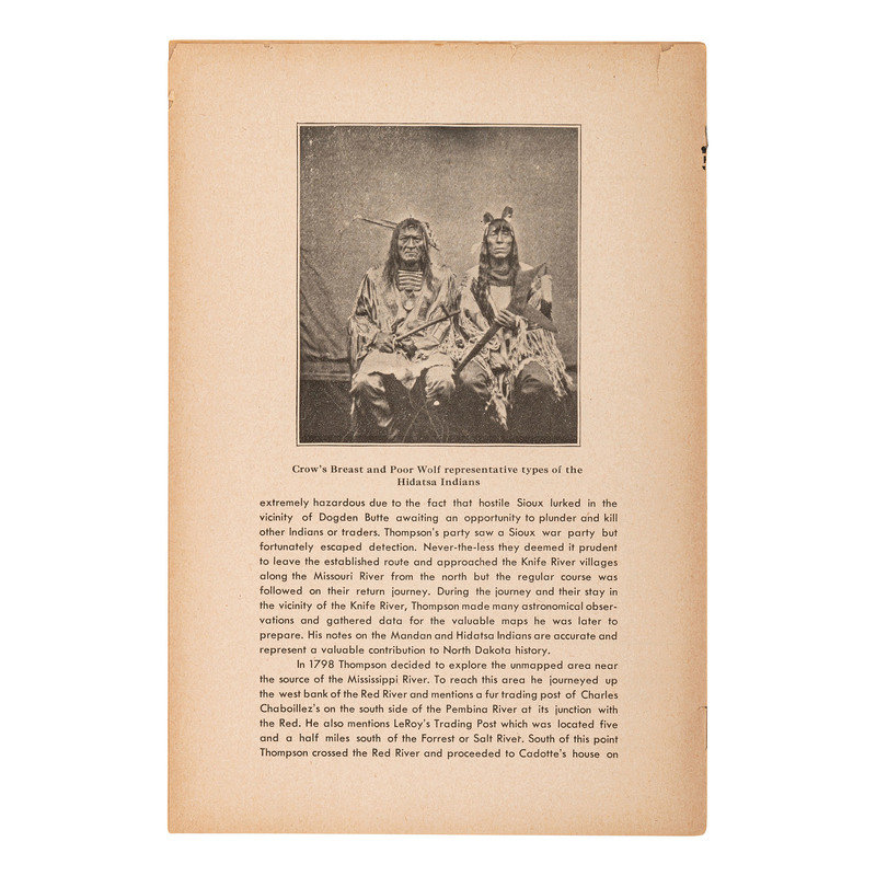 [With:] The Museum Review. Vol. 1, No. 6. Bismarck, North Dakota: State Historical Society of North Dakota, June 1946. 8pp., 6 x 9 in. (incomplete issue, 4pp. fully separated, some chipping to edges). Contains printed illustration of Morrow's portrait of Crow's Breast and Poor Wolf.