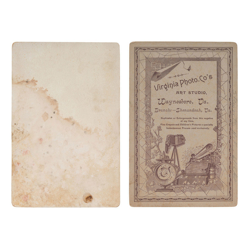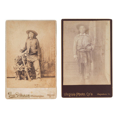 Cabinet card featuring full standing studio portrait of a young Native American man holding a Winchester 1876 rifle in his right hand. Subject also has a Colt single-action revolver tucked into the waistband of his pants which appear to have been pulled on top of another pair of pants, indicating that perhaps the clothing and weapons may have been studio props. Heppner, Oregon: Theo Danner, n.d. (dampstain on verso affecting approx. 2/3 image, soil, wear to corners). Danner's imprint on mount recto. -- Cabinet card standing studio portrait of a young Native American man in western-style apparel with his hand casually resting on sash at his waist. Waynesboro, Virginia: Virginia Photo. Co's, n.d. (scattered markings, wear to corners, light contrast). Imprint on mount recto and verso.