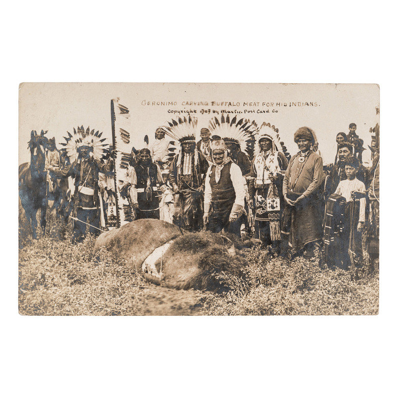 [NATIVE AMERICANS]. Geronimo Carving Buffalo Meat for His Indians. Kansas City, Missouri: Martin Post Card Co., [ca 1907-1911].