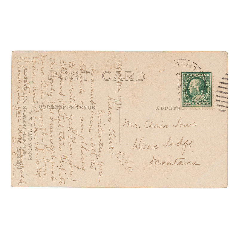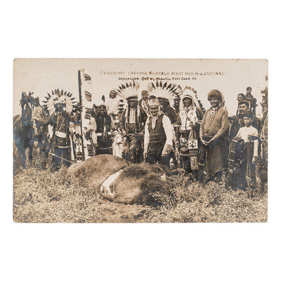 5 3/8 x 3 1/2 in. real photo postcard. Title and copyright information written in image. Verso with card publisher's imprint and a personal message addressed to Clair Lowe in Deer Lodge, Montana and dated 12 April 1911. Image features Geronimo wielding a knife before a fallen buffalo as his fellow tribesmen are gathered behind him.