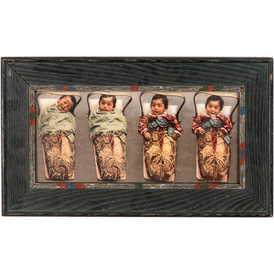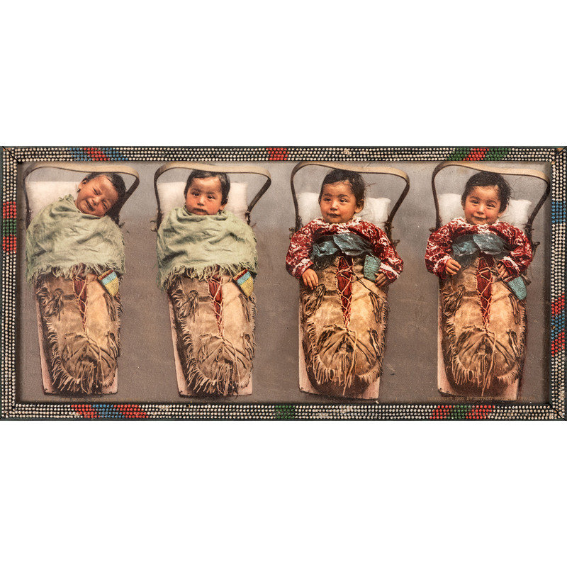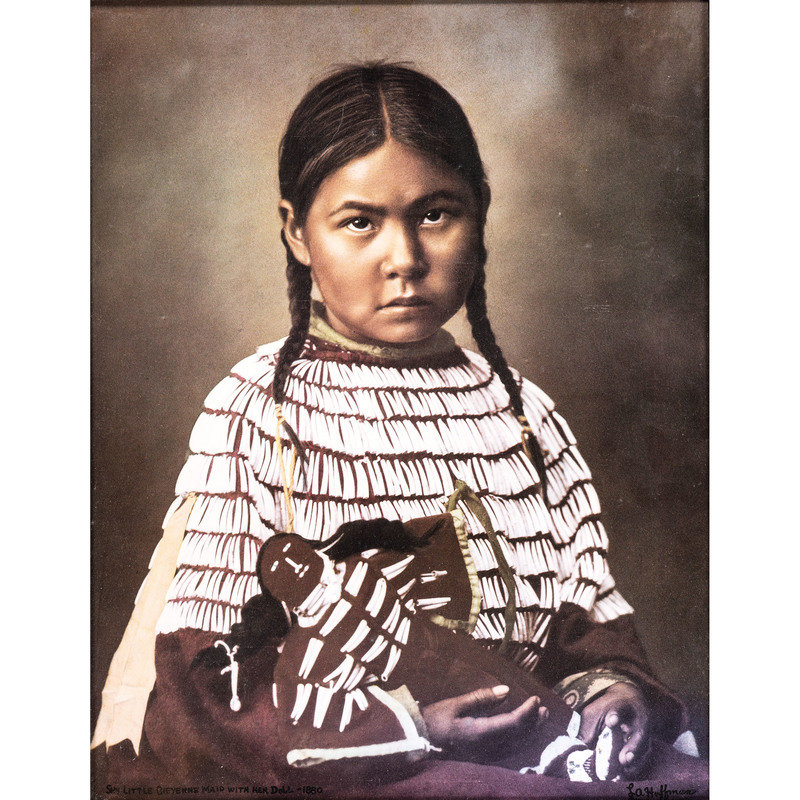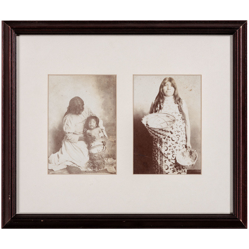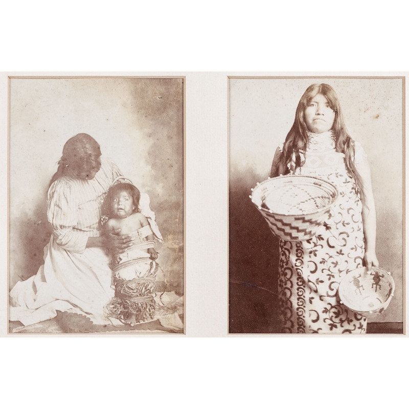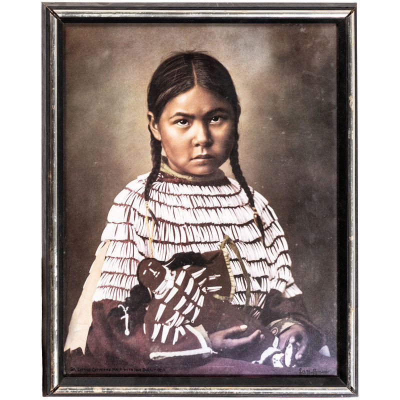 HUFFMAN, L.A., photographer, after. Sky Little Cheyenne Maid with her Doll. Miles City, MT: Coffrin's Old West Gallery, 1974. 10 1/2 x 13 3/4 in. lithograph (visible area), framed (slight fading, unexamined out of frame). -- Apache chief. Detroit, MI: Detroit Photographic Co., n.d. [ca 1899]. 6 1/2 x 8 in. photochrom (visible area), matted and framed (colors rich, unexamined out of frame). -- Babes of the Wood. Two Pairs of Twins. Detroit, MI: Detroit Photographic Co., 1903. 14 1/2 x 6 1/2 in. photochrom (visible area), framed (some discoloration, unexamined out of frame). -- Princess Angeline, daughter of Chief Seattle. N.p.: n.p., n.d. [ca early 20th century]. 3 3/4 x 7 3/4 in. lithograph (visible area), framed (some water staining, unexamined out of frame). -- 2 silver gelatin photographs, 3 3/4 x 5 1/2 in. (visible area) showing Apache woman with child and Maricopa woman, as identified on modern note, each attributed to Miller Gray. N.p.: n.p., [ca early 20th century]. Matted and framed together (fading, spotting, unexamined out of frame). -- Chief on horseback. N.p.: n.p., n.d. [ca early 20th century]. 5 1/2 x 7 1/2 in. silver gelatin photograph, matted and partially mounted (rich tones). -- Portrait of aged Native American subject holding bag of flour. N.p.: n.p., n.d. [ca early 20th century]. 4 1/2 x 6 1/2 in. silver gelatin photograph (visible area), matted and framed (rich tones, unexamined out of frame). -- Unidentified chief or warrior. N.p.: n.p., n.d. 8 1/2 x 11 1/2 in. print (visible area) (some fading, some surface spotting, unexamined out of frame).