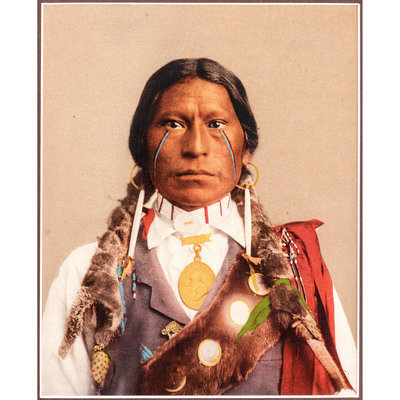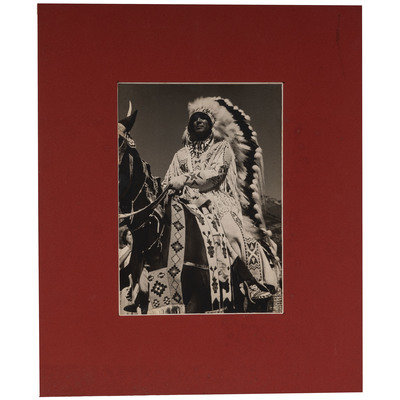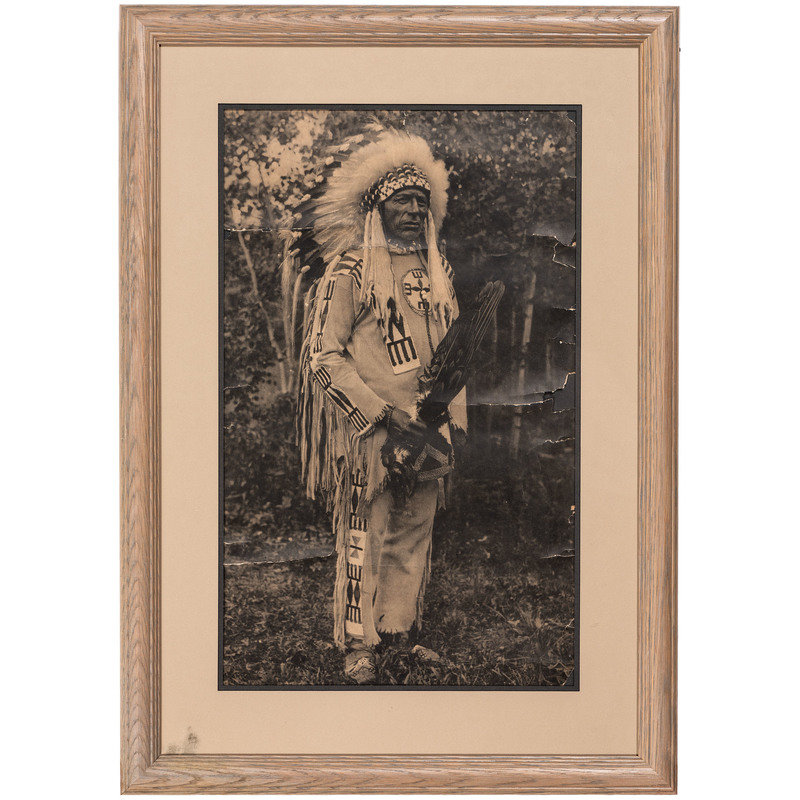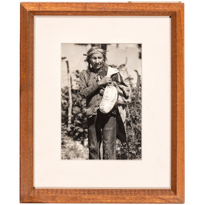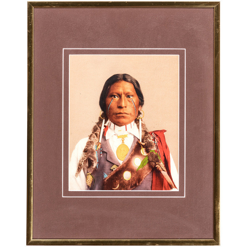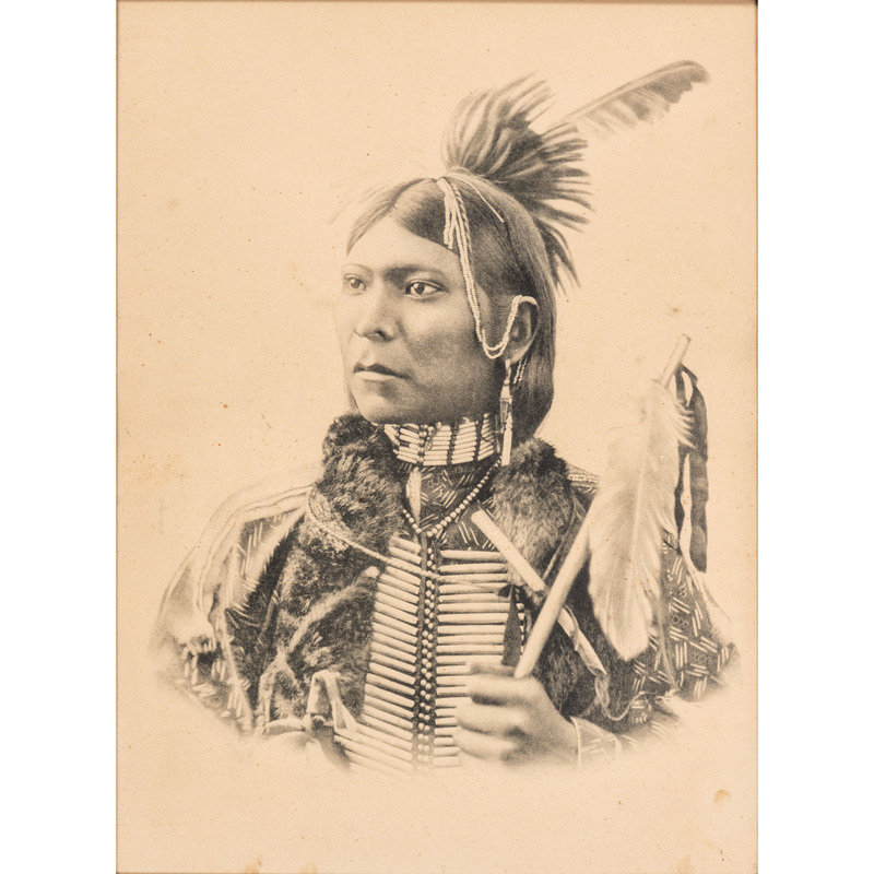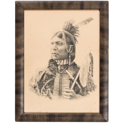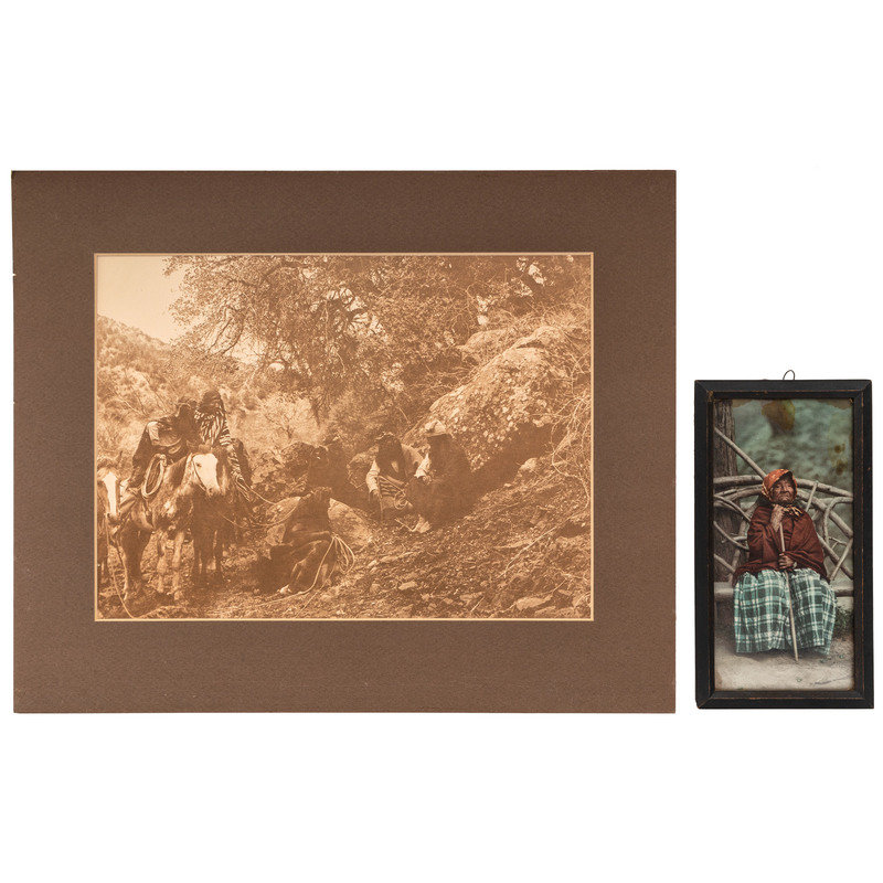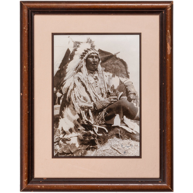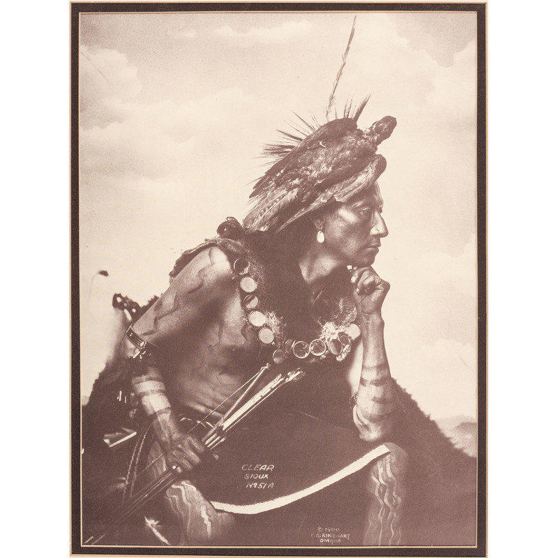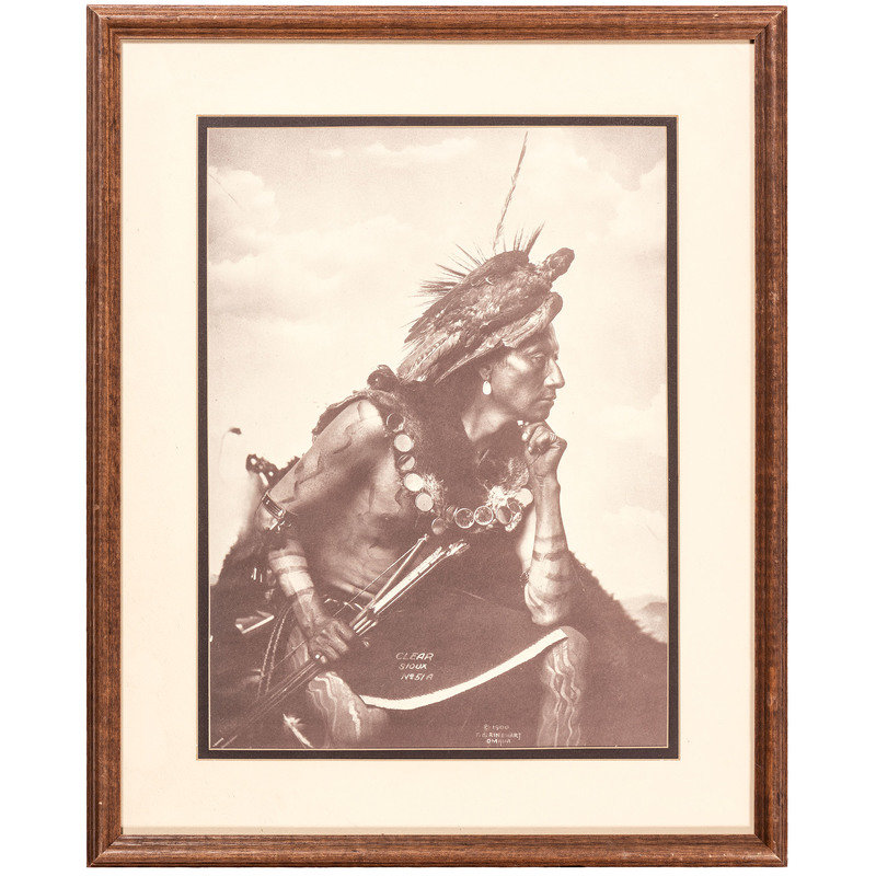 [With:] White Man Runs Him. N.p.: n.p., [ca early 20th century]. 9 3/4 x 13 3/4 in. enlarged print (visible area) with signature and copyright at lower right, although name is difficult to discern, matted and framed (unexamined out of frame). -- CURTIS, Edward, photographer, after. Story-Telling Apache. 10 x 14 in. photogravure (not including margins), partially attached to mat (few surface abrasions near lower left edge/corner of image and margins). Modern restrike. -- RINEHART, F.A., photographer, after. Medicine Cloud, Sioux. Omaha, NE: 1900. 13 1/2 x 17 1/2 in. enlarged print after photograph mounted under mat. -- RINEHART, F.A., photographer, after. Clear Sioux. Omaha, NE: 1900. 11 1/4 x 15 1/2 in. enlarged print after photograph (visible area), matted and framed (few spots, unexamined out of frame). -- 5 enlarged photographs or prints of other Native American subjects, incl. chiefs in traditional dress, a Native American in Anglo-style clothing, and young girl in traditional dress, condition generally fair to good.