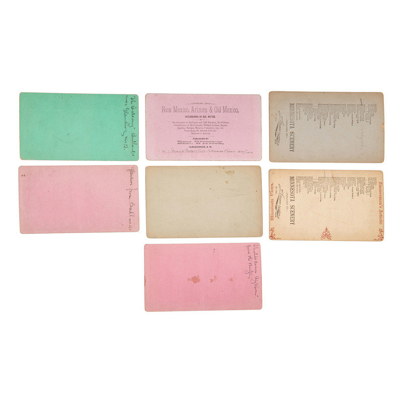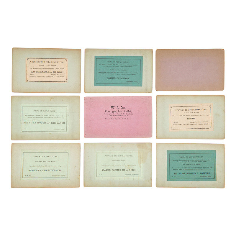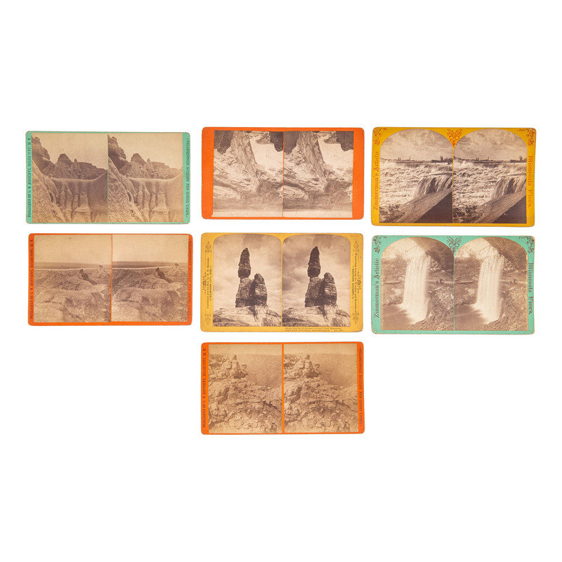 34 stereoviews on assorted mounts, ranging in size from 7 x 3 3/8 to 7 x 4 1/2 in. Group includes 7 cabinet sized stereoviews on yellow mounts from the "U.S. Topographical and Geological Survey of the Colorado River Region of the West" by J.W. Powell and A.H. Thompson featuring photography by J. Fennimore (2), E.O. Beaman, and John Hillers (4); 3 views from the "Yellowstone Scenery and Indian Views" series by L.A. Huffman featuring period ink inscriptions on verso; 2 cabinet sized stereoviews from "Zimmerman's Artistic Minnesota Views" series including "Minne-ha-ha. (Laughing Water)" and "St. Anthony Falls. Minn;" 2 other views by Zimmerman featuring a Wisconsin rock formation and a Chippewa domestic scene; one view featuring Gold Bearing Pyramid in California by J.J. Reilly; 2 Egyptian views of mosques by A. Braun; and 17 others.