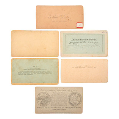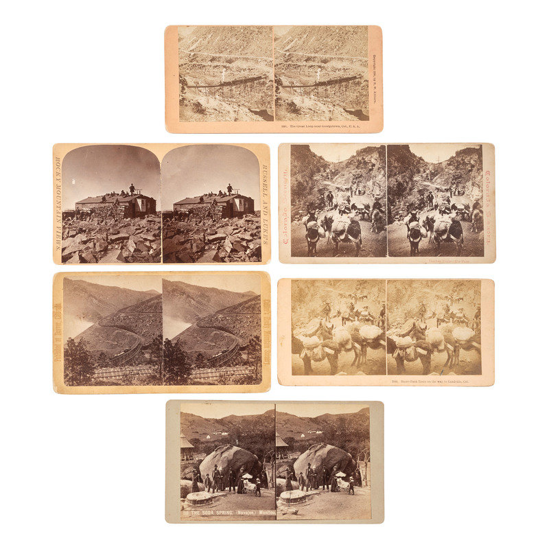 The Great Loop near Georgetown, Col., U.S.A. Littleton, NH: B.W. Kilburn, 1890. -- Ute Pass. Denver, CO: W.G. Chamberlain, n.d. -- Colorado Central Railroad Extension to Central City. Denver, CO: Collier, n.d. -- WEITFLE, Charles, photographer. The Soda Spring. (Navajoe,) Manitou. Colorado Springs, CO: Charles Weitfle, n.d. -- Burro Pack Train on the way to Leadville, Col. Littleton, NH: Kilburn Brothers, n.d. -- And 3 others. Together 8 stereoviews, condition generally very good.