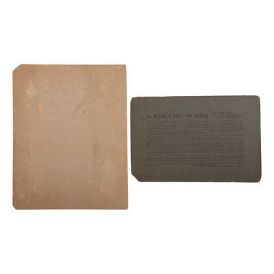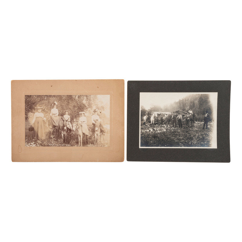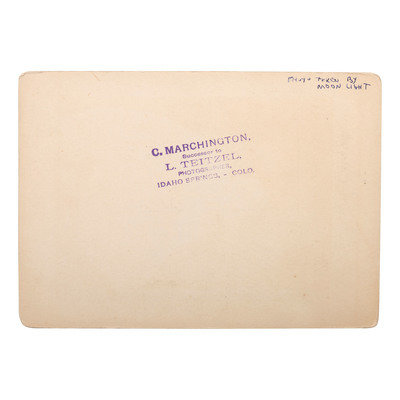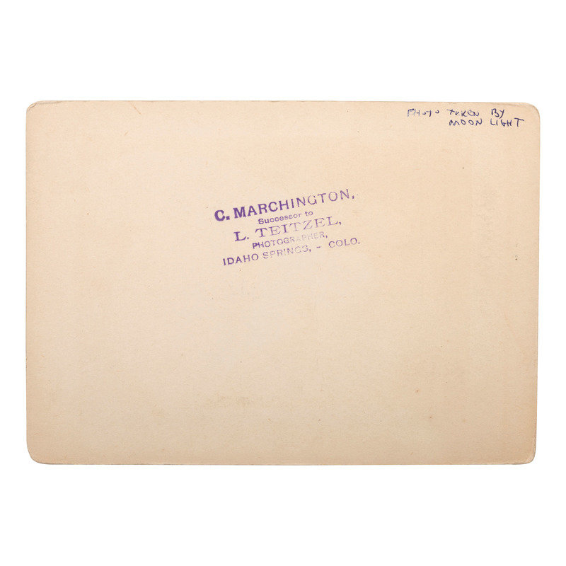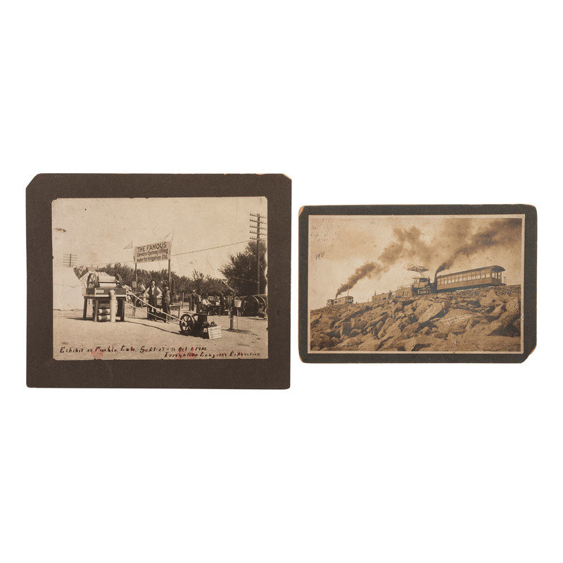 [With:] GERLACH, C.W. Manitou July 20, 1902. Manitou, CO: Gerlach, 1902. 7 5/8 x 4 1/2 in. albumen photograph on cardstock mount (some fading). Four women smile while riding donkeys, a fifth stands nearby. -- MARCHINGTON, C. New House Tunnel by Moon Light. Idaho Springs, CO: Marchington, n.d. 6 x 4 in. photograph on cardstock mount (light surface abrasions). -- HIESTAND, J.G. U.S. Signal Station, Summit at Pike's Peak. Iron Springs, Manitou, CO: Hiestand, [ca 1901]. 8 x 5 in. albumen photograph on cardstock mount. -- Exhibit at Pueblo, Colo. Sept 19th to Octo 1. 1910. Irrigation Congress Exposition. [Denver]: N.p., 1910. 8 1/8 x 6 in. silver gelatin photograph on cardstock mount. -- And 9 other photographs, also with 2 modern prints from old negatives and 1 photogravure of Idaho Springs. Together 16 items, condition generally good.