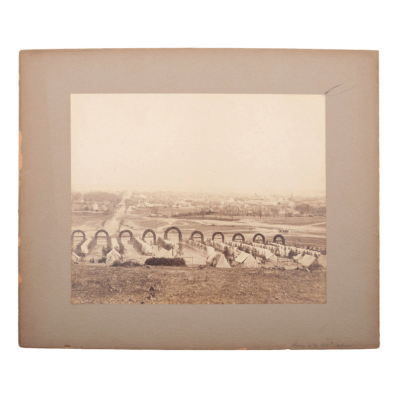 An outdoor view of 44th New York Infantry's camp of tents with 10 arches designating companies. The city of Alexandria is visible in the background. RARE: online records locate no auction records.