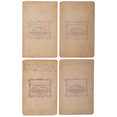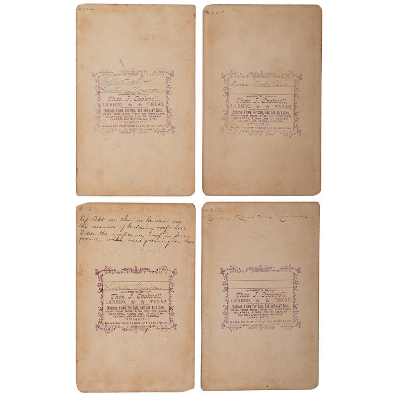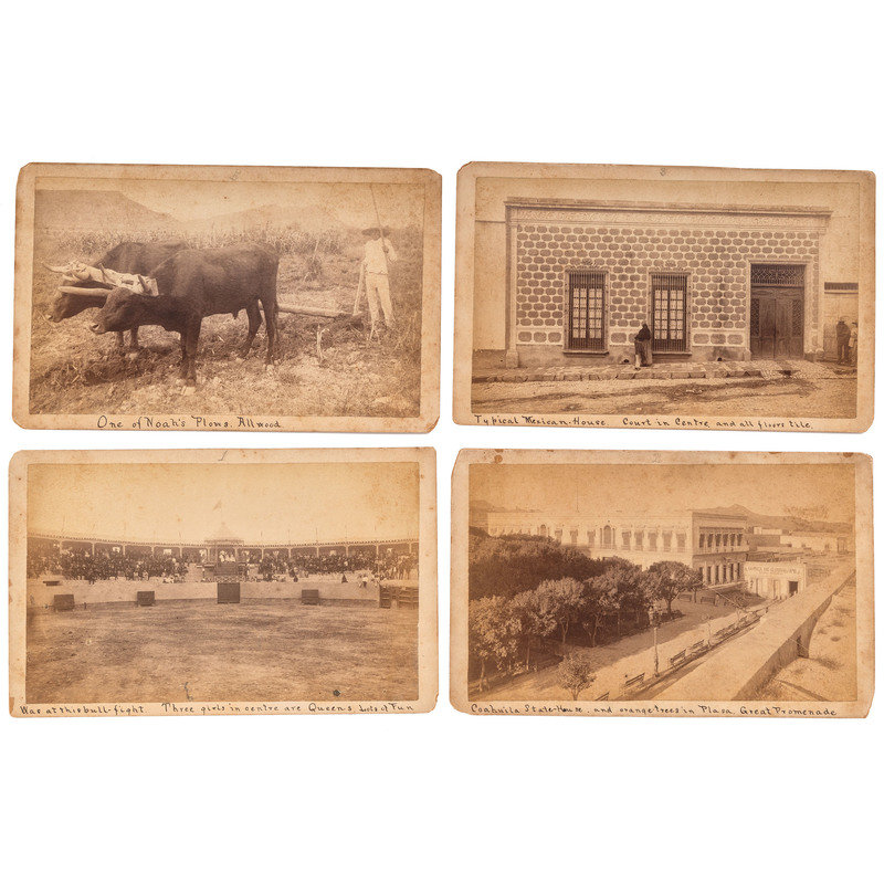 COCKRELL, Thomas J., photographer. Coahuila state-House and orange trees in Plasa. Great Promenade. -- Typical Mexican House. Court in Center, and all floors tile. -- One of Noah’s Plows. All wood. -- Was at this bull-fight. Three girls in centre are Queens. Lots of fun. -- Together, 4 boudoir cards, Laredo, Texas, n.d., some with previous ownership inscriptions.