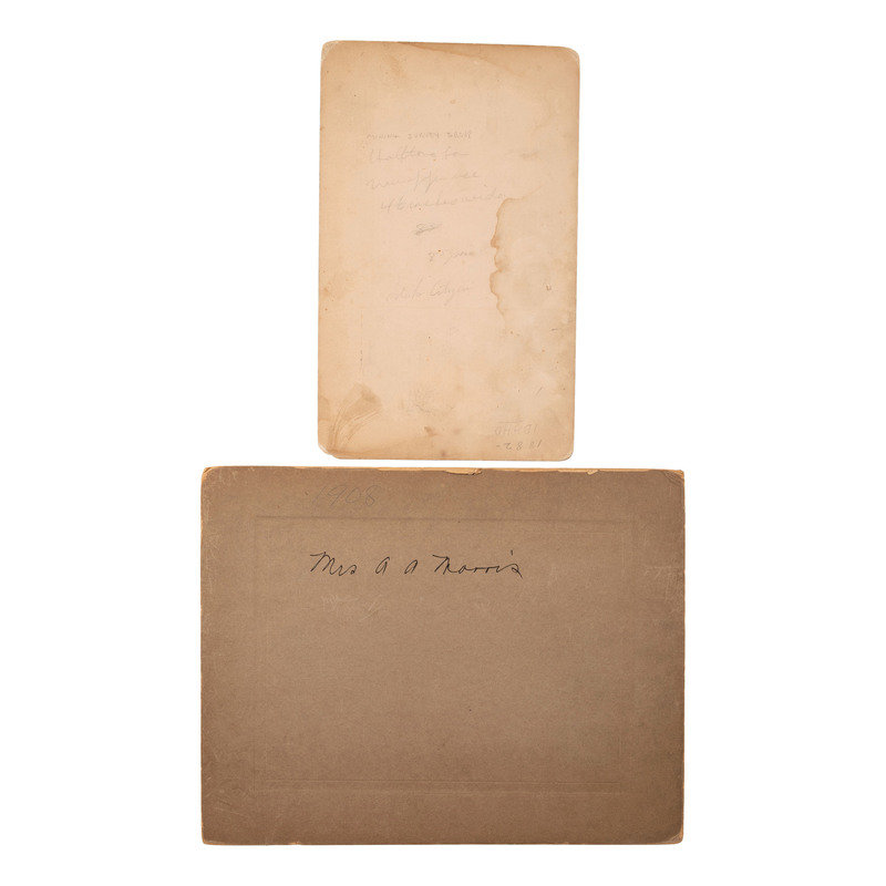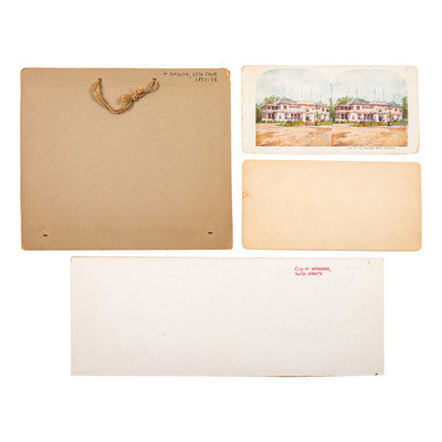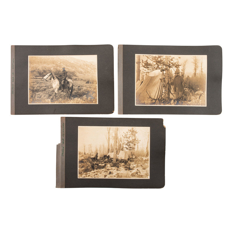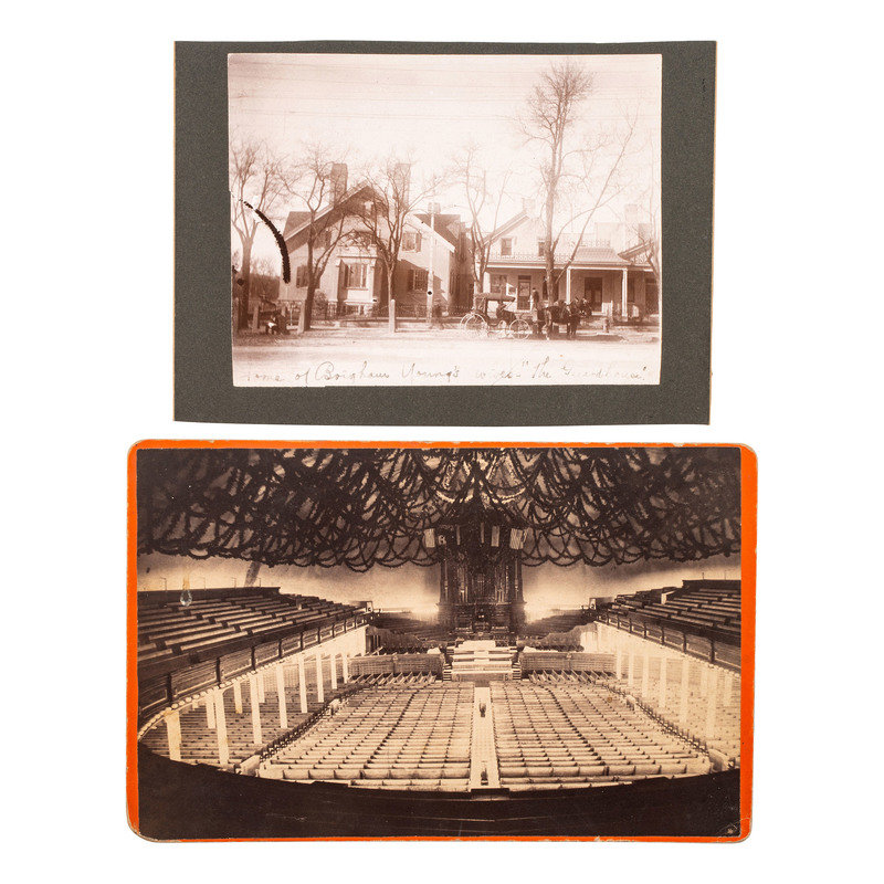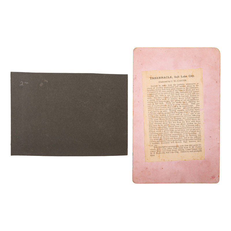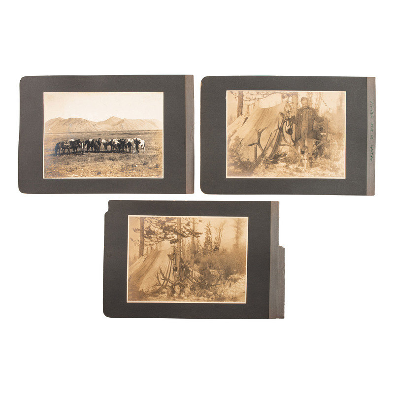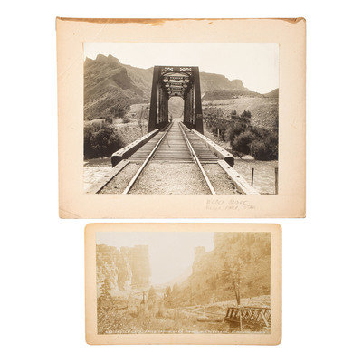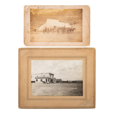 Home of Brigham Young's wives - "The Guard House." [Salt Lake City, UT]: N.p., n.d. 4 3/4 x 3 5/8 in. black and white photograph on cardstock mount (black mark to left edge, light surface scratches). Title inscription in lower edge of photograph. -- CARTER, C.W., photographer. Tabernacle, Salt Lake City. Salt Lake City: James Dwyer and W.F. Raybould, n.d. 6 3/4 x 4 3/8 in. cabinet photograph on cardstock mount (small stain to left edge, light surface abrasions). -- FAIRCHILD, C., photographer. Main Street, Roundup, Mont. Roundup, MT: Fairchild Studio, [1908]. 6 5/8 x 4 5/8 in. black and white photograph on cardstock mount (light surface scratches). Photographer's imprint in negative and to mount recto. -- MARTIN, A., photographer. Castle Gate. Price Canon. Utah. D + R G. R.R. Western. Denver: Martin, n.d. 7 x 4 1/8 in. albumen photograph on cardstock mount (fading). -- Group of 6 outdoor images of a hunting party in Jackson Hole. [Wyoming]: N.p., n.d. 6 7/8 x 5 in. silver gelatin photographs on cardstock album leaves (some toning; minor warping to cardstock). -- And 19 other photographs, and 14 modern prints from old negatives and prints.