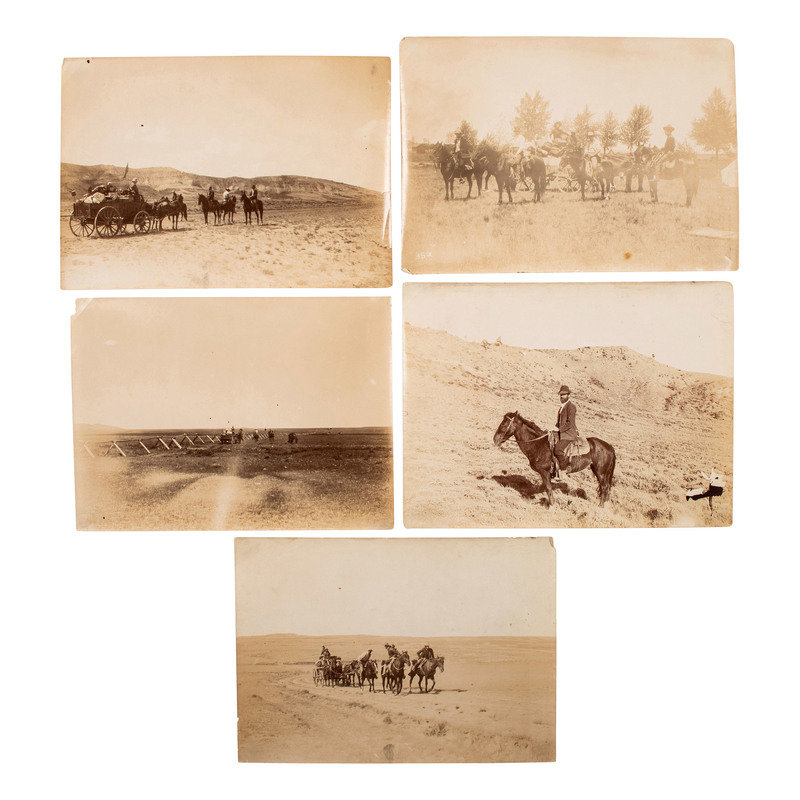 [With:] HAYNES, Jack Ellis (1884-1962). Sapphire Pool Biscuit Basin. -- Roaring Mountain. -- Mammoth Hot Springs Terrace. -- Rapids above the Upper Fall. -- Lake Camp Entrance. St. Paul, MN: Haynes, n.d. Approx. 4 3/4 x 3 3/4 in. silver gelatin photographs on cardstock. Photographer's imprint and copyright to versos. All views from Yellowstone National Park where Jack Ellis and his father, Frank Jay Haynes, were both official photographers.