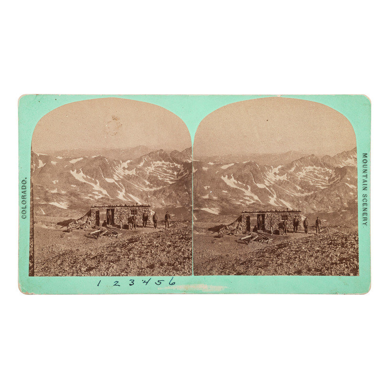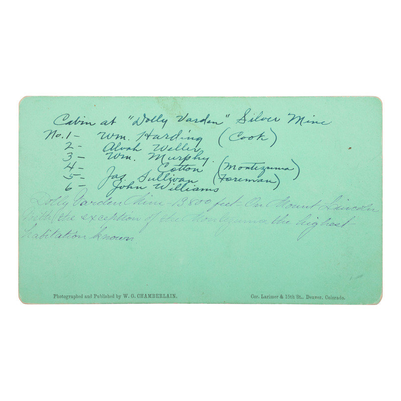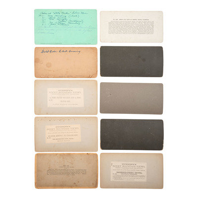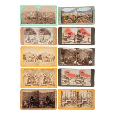 CHAMBERLAIN, William Gunnison, photographer. Cabin at "Dolly Varden" Silver Mine. Denver: W.G. Chamberlain, [ca 1864-1877]. 6 1/2 x 3 1/2 in. Photographer's imprint to verso. Period inscription identifies the location and the 6 miners: William Harding (cook), Alvah Weller, William Murphy, Cotton (Montezuma), Jas. Sullivan (Foreman), and John Williams). Also with a short explanation of the location of the mine. From Chamberlain's Colorado. Mountain Scenery series. -- JONES, O.L., photographer. Two hand-tinted outdoor views of fire at Cripple Creek with firefighters and wagon. 5 5/8 x 3 1/4 in. Photographer's imprint in negative on one. -- The Greyhound Lode, (Galena.) Cheyenne Mountain. Colorado Springs: B.H. Gurnsey, [ca 1872-1880]. 6 1/8 x 3 3/8 in. Paper label to verso. From Gurnsey's Rocky Mountain Views. Scenes on the Line of the Denver & Rio Grande Railway series. -- Nightingale Mine, Bull Hill, earth's richest gold - Ripple Creek, Colo. New York: Underwood & Underwood, n.d. 6 x 3 1/4 in. -- And 5 others. Together, 10 stereoviews on cardstock mounts. Condition generally good.