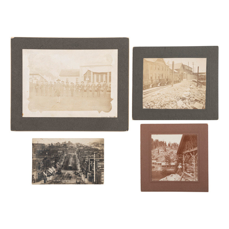 [With:] HILEMAN, T.J., photographer. Bennett Ave. Cripple Creek. Colorado, [ca 1910]. 5 3/8 x 3 3/8 in. real photo postcard. Postally unused. -- JACKSON, J., photographer. Outdoor image of armed men identified as the Colorado Militia. Colorado, [ca 1894]. 7 1/8 x 5 in. albumen photograph on cardstock mount. Photographer's imprint inked to recto. Pencil inscription to verso. Tentatively identified to when the Colorado Militia were called in support of striking workers in the Cripple Creek miners' strike of 1894. -- And 2 others. Together 4 images. Condition generally good.