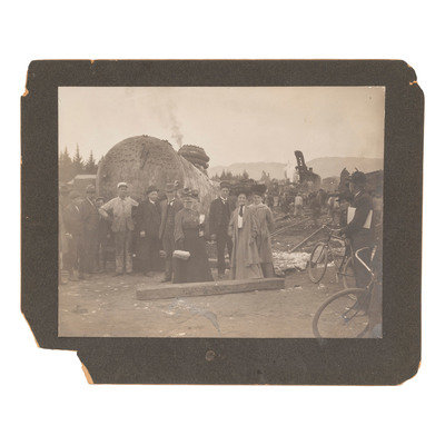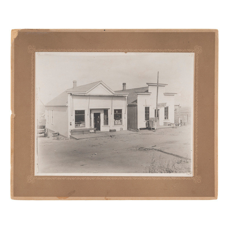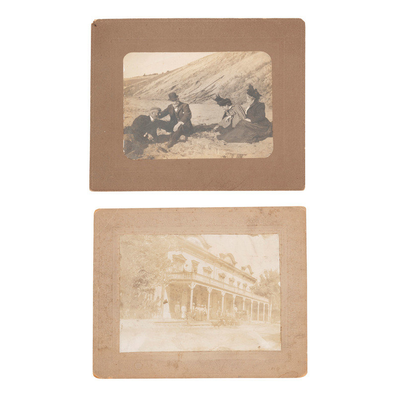Outdoor image of two stores in Tonopah. Tonopah, NV: N.p., n.d. 8 1/2 x 6 3/4 in. silver gelatin print on cardstock mount (light abrasion to image edges; chipping to mount corners). Two men are visible in the doorway. A sign advertises "The New and Popular Game Box Ball for Ladies & Gents." Verso with a later pencil inscription "Grandpa's Store, Tonopah." -- CHAFFIN, F.J., photographer. Goldfield Nevada Exploded Engine Boiler May 1910. Goldfield, NV: Chaffin, May 1910. 8 x 6 1/8 in. silver gelatin photograph on cardstock mount (chipping to mount). Photographer's hand-written imprint written on railroad tie in image. Pencil inscription to verso. A group of well-dressed men and women pose in front of the exploded boiler. Many other figures, some with bicycles, are visible to the sides and in the background. -- Outdoor portrait of 2 men and 2 women sitting. Goldfield, NV: N.p., 1900. 4 1/2 x 3 1/2 in. silver gelatin on cardstock mount (light wear to edges). Pencil inscription to verso. -- Golden Eagle, Reno Nev. Reno, Nevada: N.p., n.d. 4 3/4 x 3 3/4 in. albumen photograph on cardstock mount (faded, some soiling). A group poses on the front porch of a large building marked "Golden Eagle." A horse-drawn carriage and a dog are parked in the street. -- Together, 4 photographs.