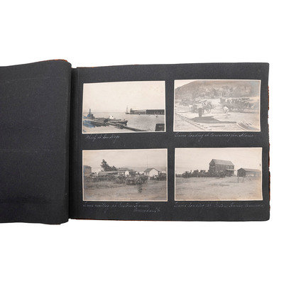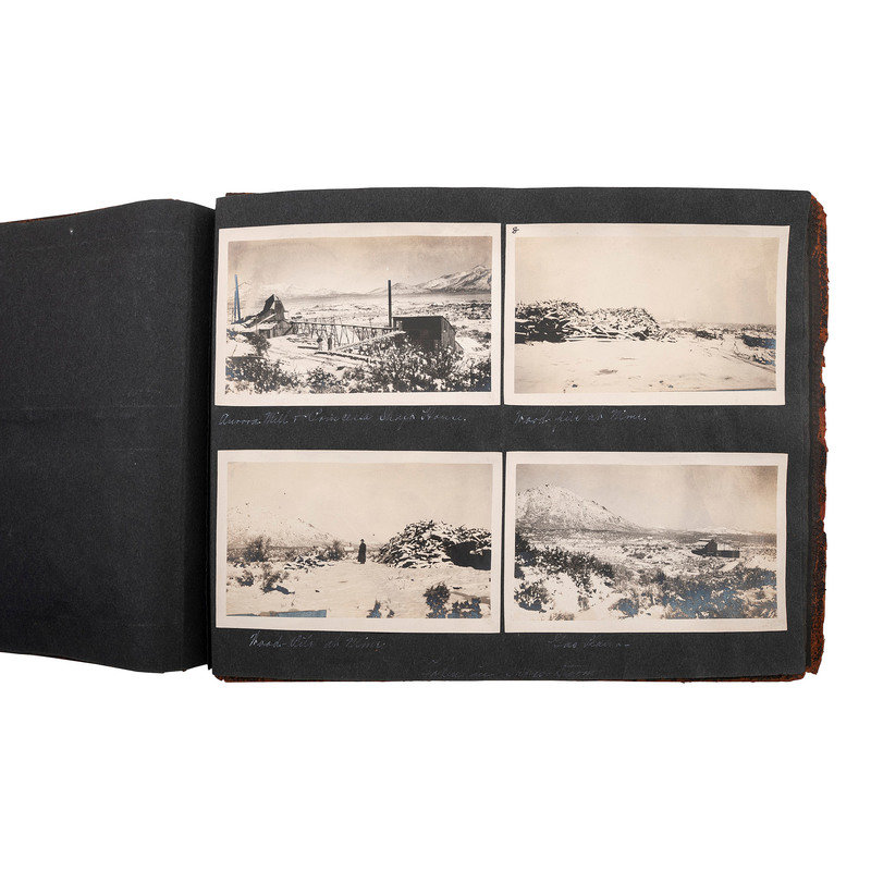 13 3/4 x 10 in. leather album with 59 silver gelatin photographs approx. 5 1/2 x 3 1/4 in. and 2 silver gelatin photographs 9 3/4 x 7 3/4 in. with white ink captions.