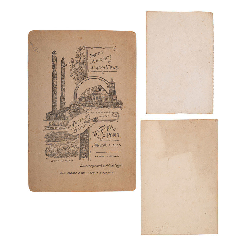 4 1/2 x 7 3/8 in. albumen photograph on cardstock mount (toning, light abrasion to image surface, corner wear to mount). Studio imprint on verso. Portrait of group of individuals posed in front of a log cabin church. This image, Winter & Pond "58," is identified as a log cabin church at the corner of Third Street and Main Street in Juneau.