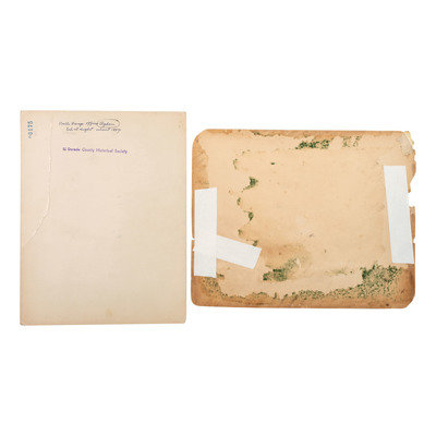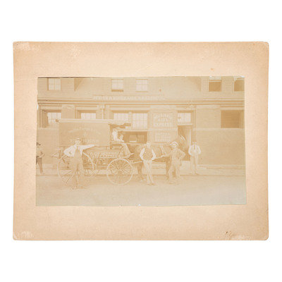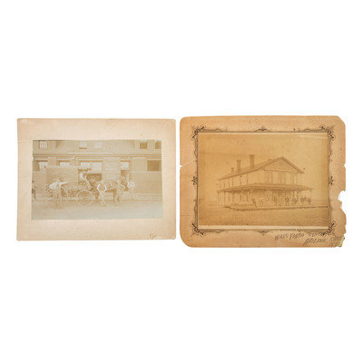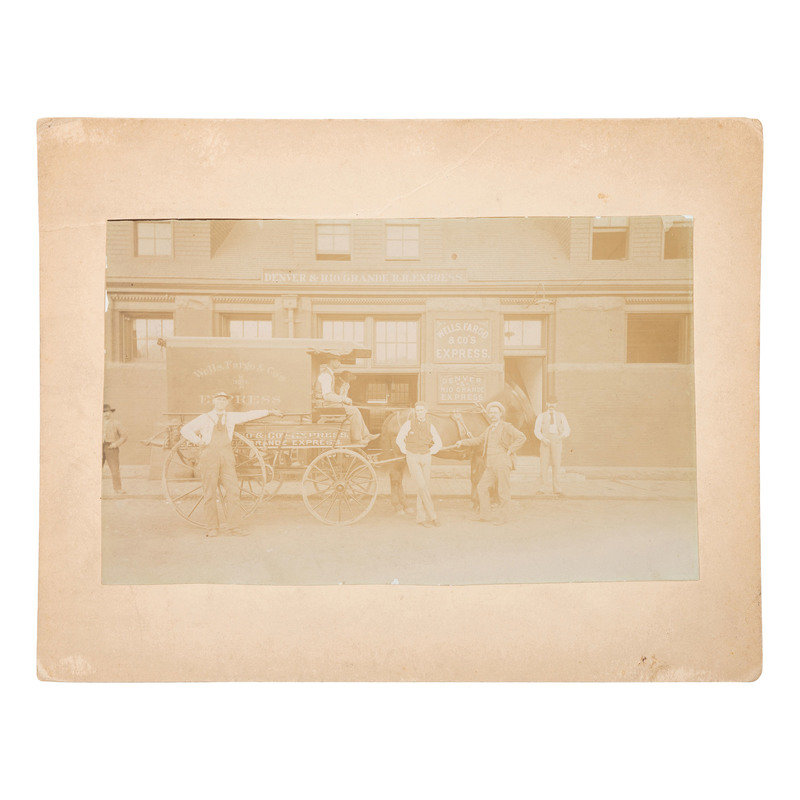 [With:] Outdoor portrait of 5 men and a dog with a Wells Fargo horse-drawn express wagon. [Ogden, UT]: N.p., [ca 1897]. 7 3/4 x 4 3/4 in. albumen photograph on cardstock mount (faded). Ink inscription to verso. Provenance: El Dorado County [CA] Historical Society (stamp to verso). Four men pose next to the horse and wagon labeled "Wells Fargo & Co's Express" in front of the Denver & Rio Grande R.R. Express office. A fifth man sits with a hound in the driver's seat. Another figure is partially visible in the background.