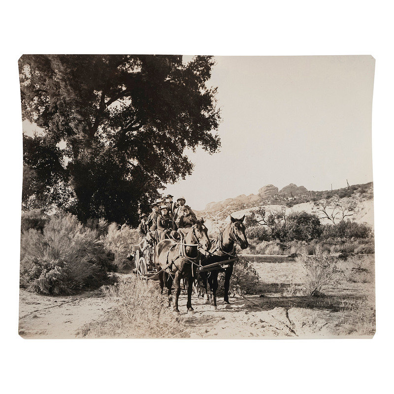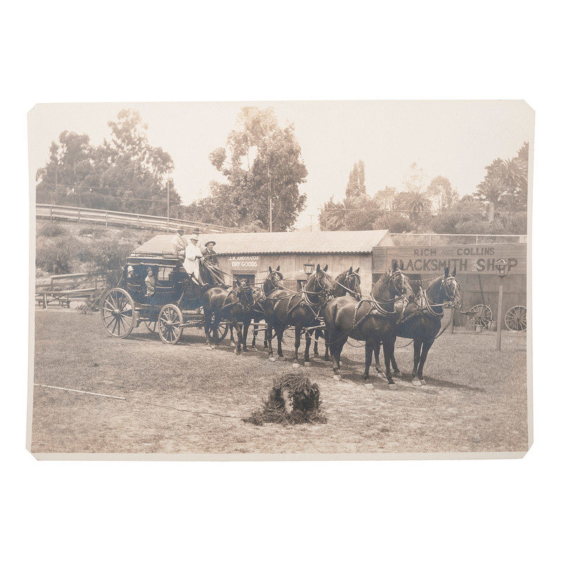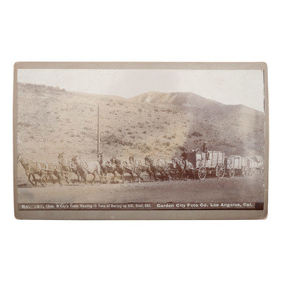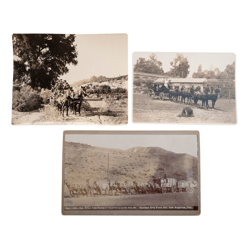PIERCE, C.C., photographer. Outdoor photograph of a California stagecoach. Los Angeles: C.C. Pierce, [ca 1890]. 7 1/2 x 6 in. photograph. Provenance: Ben Powers (stamp to verso). -- Chas. M'Coy's Team Hauling 15 Tons of Barley up hill, Simi, Cal. Los Angeles: Garden City Foto Co., [ca 1900]. 8 1/4 x 4 3/4 in. photograph on cardstock mount (light fading). Title and photographer's imprint in negative. Photographer's stamp to verso. -- GREENE, P.H., photographer. Wells Fargo Stage Coach at Santa Barbara American Railway Express. Santa Barbara: P.H. Greene, 1928. Provenance: Ben Powers, Los Angeles (inscription to verso). 6 3/4 x 4 3/4 in. (corners clipped). Photographer's stamp to verso. Inscription to verso.