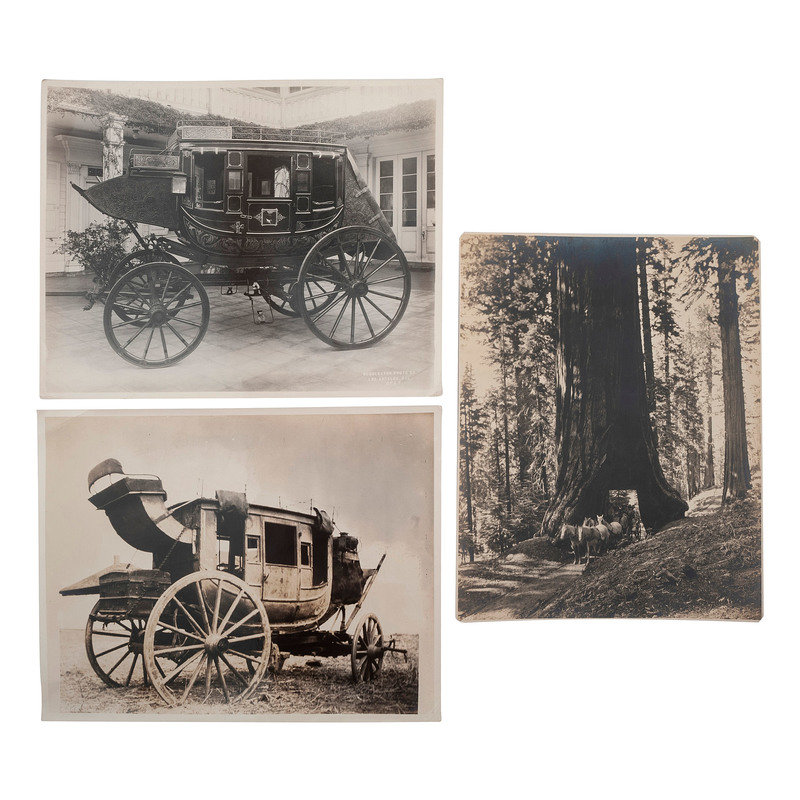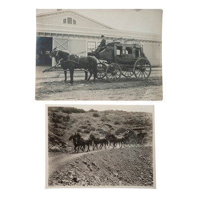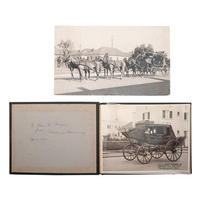 Outdoor image of a stagecoach with a team of 6 horses. [Los Angeles]: N.p., n.d. 13 1/2 x 8 1/2 in. photograph mounted to cardstock. Provenance: Captain William Banning, to Benjamin Powers (note to verso). Ink inscription to verso, dated 1924: "Given to me by Capt. William Banning of Catalina Island, etc." -- PIERCE, C.C., photographer. Capt. Banning driving their First stage around the Island. Los Angeles: C.C. Pierce, [1887]. 8 3/8 x 6 3/8 early 20th-century reprint. -- Album with 10 photographs of stagecoaches and diagrams/drawings of coaches. Los Angeles: Keystone Photo Service, 1925. Album 11 1/4 x 8 1/4 in.; each image 9 7/8 x 7 1/2 in. (all but 2 mounted to linen). Publisher's stamp to page versos, ink inscribed titles identifying models and manufacturers. -- And 7 other photographs.