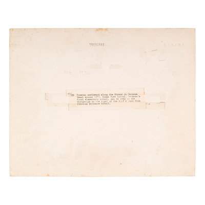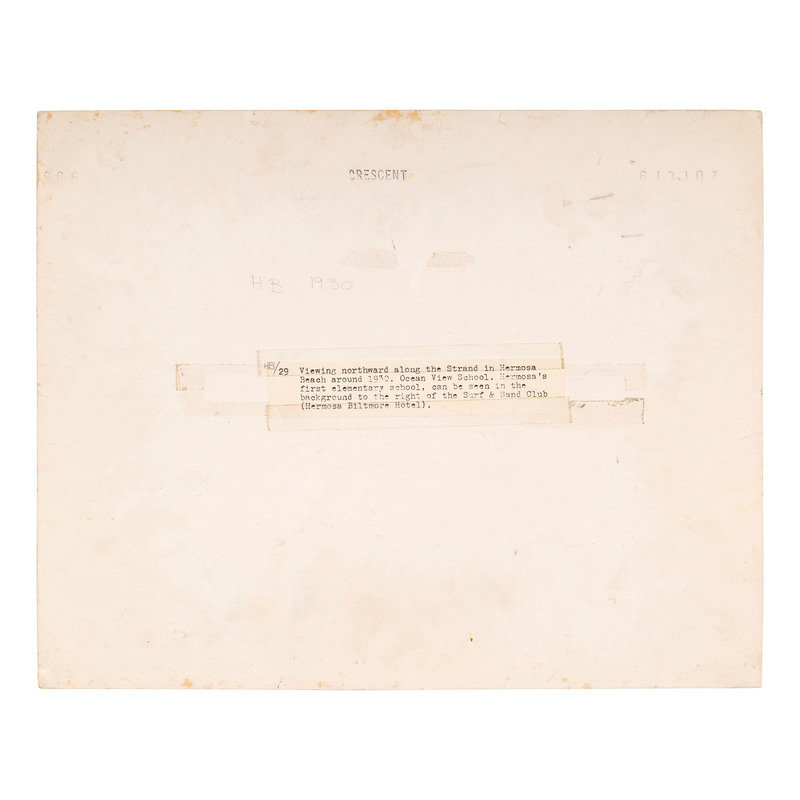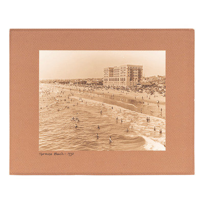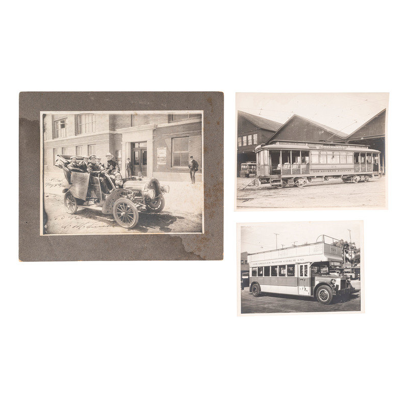6 1/2 x 8 1/2 in. photograph of six men seated in early automobile before the California Electrical Works and Western Electric Co. building. Inscription appears to read “S.F. Cal. / May 9th /06." -- 5 1/2 x 4 in. photograph of Woodman's Picnic, Long Beach, CA, by Hovey. -- 7 x 5 in. photograph of Escondido Station, California. Inscription below, "Grape day, Sept. 9, 1912, taken by Paul Kroeckel." -- 6 x 8 in. photograph of men in uniform, identified on verso as “San Diego, Calif. Pan American Calif. Exposition 1915.” -- 11 snapshots, 3 x 4 1/2 in., of pinups posed before various backdrops, mounted on album pages with ink inscription identifying location as the Pan Pacific Photo Convention, Pan Pacific Auditorium, Los Angeles, 1948.-- 2 photographs, 7 1/2 x 9 1/2 in., on cardstock mounts, of Hermosa Beach, ca 1930. -- 6 x 8 1/4 in. photograph of nearly 2 dozen horses and several men, identified in pencil on verso, “Sight [sic] of Disneyland.” -- 11 x 14 in. photograph of “Disneyland 1966.” -- 6 3/4 x 3 1/2 in. cabinet card of San Bernardino meteor. -- Numerous photographs, 8 x 10 in. or smaller, of Los Angeles, including Los Angeles Motor Coach, Los Angeles Railway, storefronts, newsstand scenes, city and landscapes, advertising photographs, actors' residences, views of the Hollywood hills, entrance to Los Angeles Olympics, and aerial views. --Approx. 26 photographs, each 8 x 10 in., printed in 20th century from Steele Photo Service negatives, documenting people, places, construction at or near San Bernardino and Mt. Baldy. Each with Steele Photo Service ink stamp on verso.