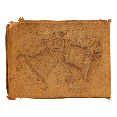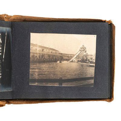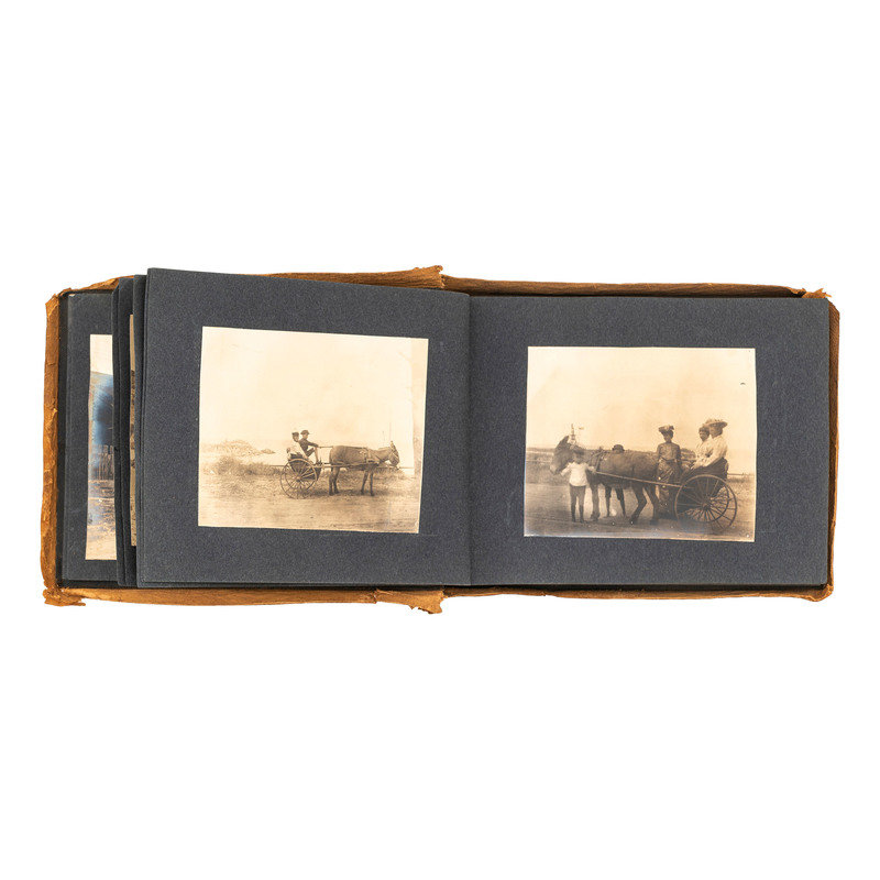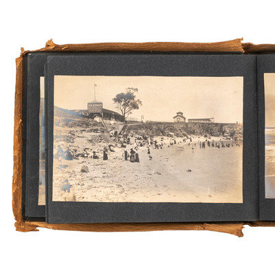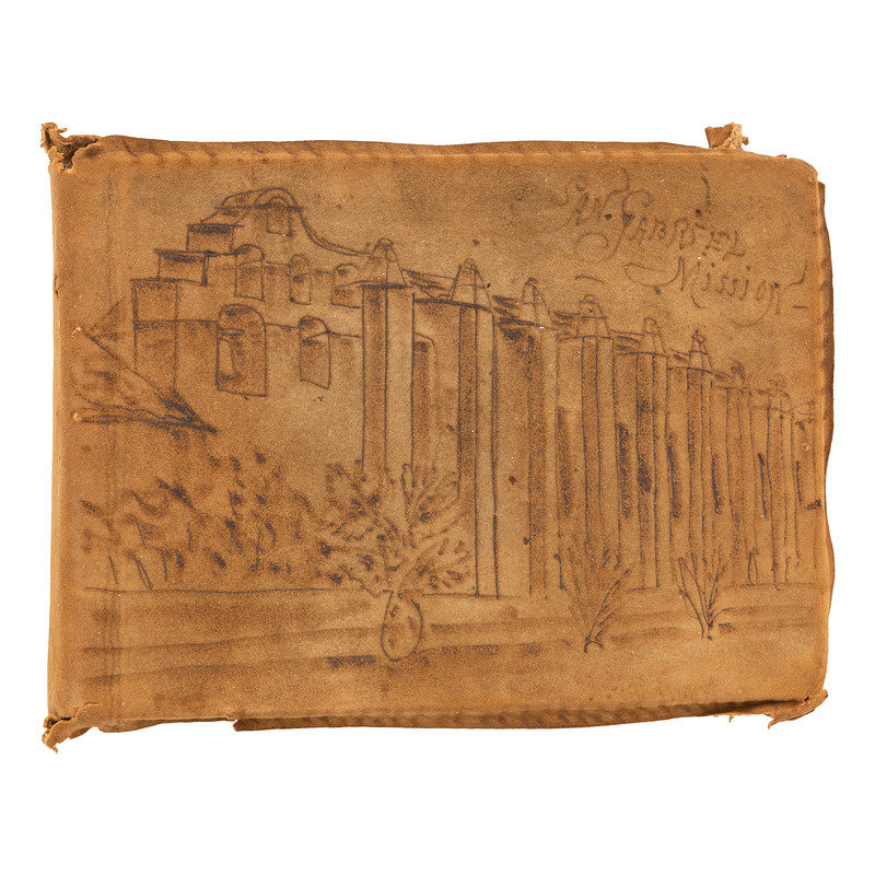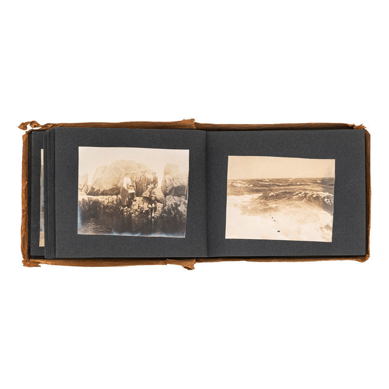 Photograph album, Obl. 6 x 8 in. Covers suede with burned outlines of “San Gabriel Mission.” 73 images include the Cawston Ostrich Farm, Pillsbury; Sacramento River; Willamette Falls; Castle Crags; Mount Shasta; Muir’s Buttes; Sea Lions on Seal Rocks near Cliff House, San Francisco, Cal.; Cliff House and Seal Rocks from Parapet, Sutro Heights; monument to Junipero Serra; Hotel del Monte; first brick house built in Calif.; more. Sizes range from 3.25 x 3.25 to 5 x 7 in.