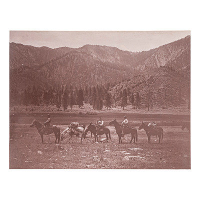 Photo 5.25 x 7 in. Men on horses with pack mules. On verso “Tejon Ranch, 1896.”