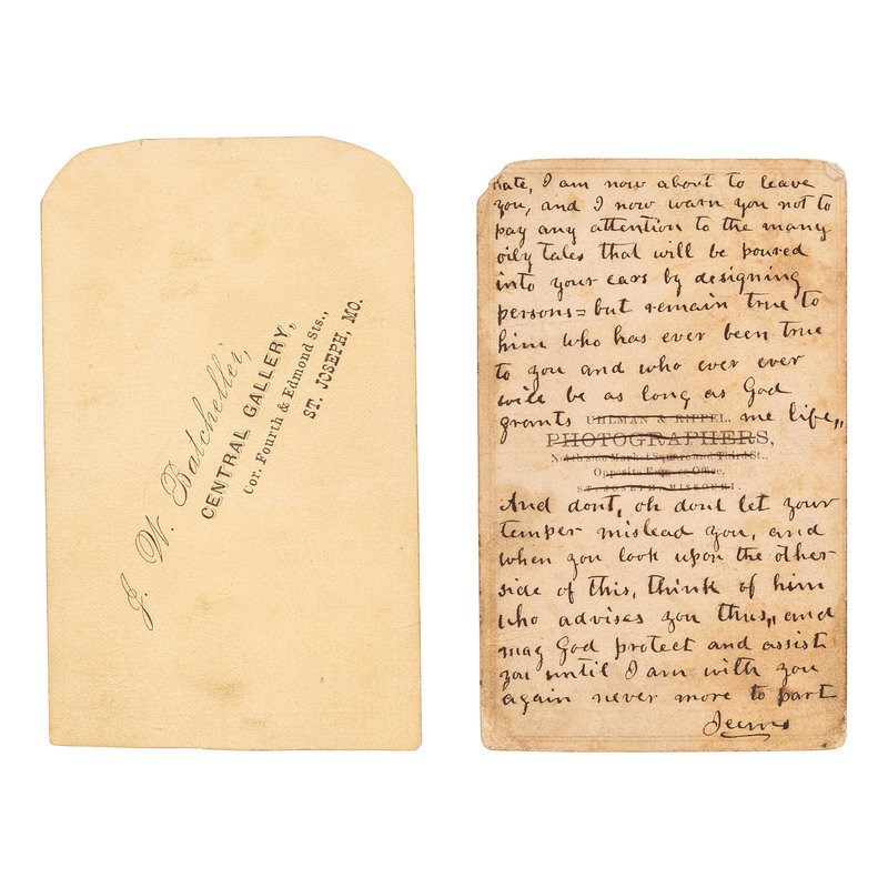Full-length studio portrait of a mustachioed cowboy wearing knee-length boots and hat with a cross drawn holstered handgun. St. Joseph, MO: Uhlman & Rippel, n.d. 2 1/4 x 3 1/2 in. CDV on cardstock mount (toned, mount edges chipped and soiled). Photographer's imprint to mount verso, crossed out in ink. Extensive and affectionate ink inscription to the verso: "Kate, I am now about to leave you, and I now warn you not to pay attention to the many oily tales that will be poured into your ears by designing persons, but remain true...And don't, oh don't let your temper mislead you, and when you look upon the other side of this, think of him who advises you thus, and may God protect and assist you until I am with you again never more to part."