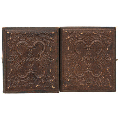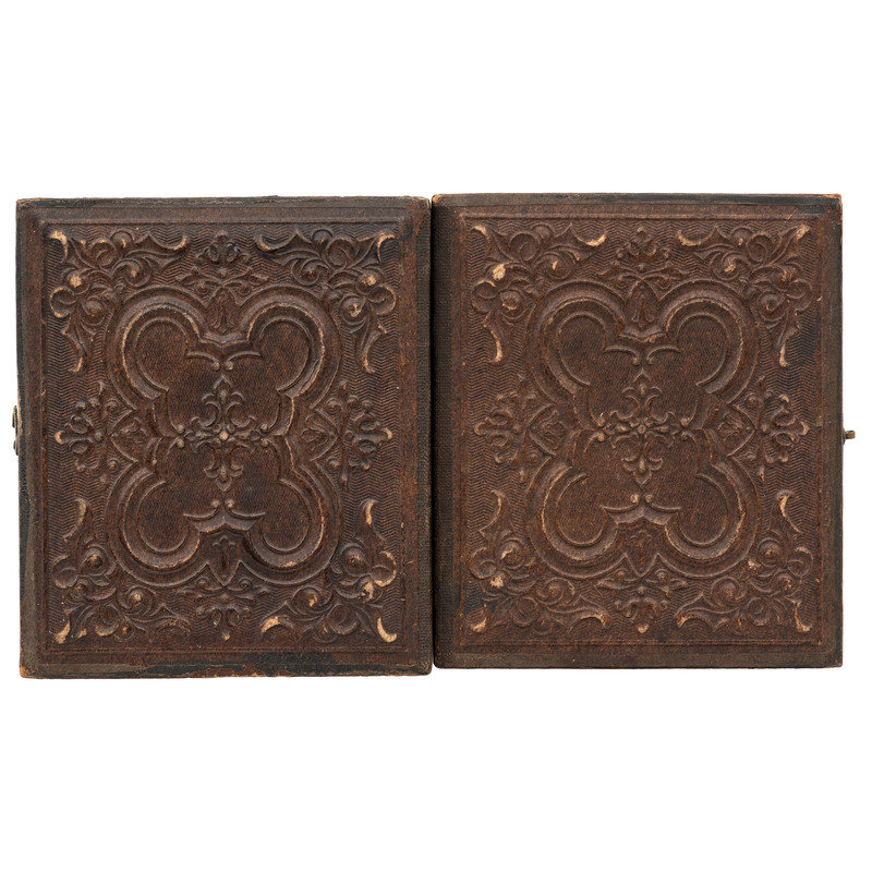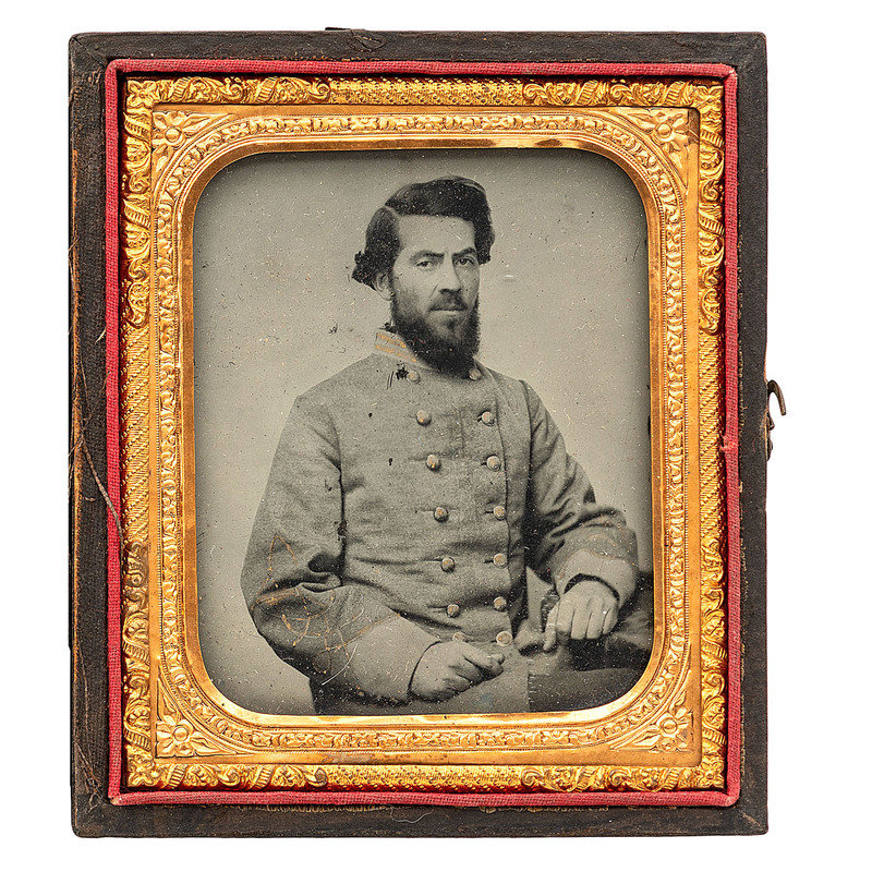 Sixth plate ambrotype half portrait of a bearded officer wearing a double-breasted frock coat with gold-highlighted collar and sleeve detail indicating his rank, and gold-highlighted buttons. N.p.: n.p., n.d. Sixth plate hand-gilt ambrotype. (Toned, with few surface imperfections; unsealed.) Housed in a pressed paper case (fully separated at spine, with general wear throughout including loss to edges and raised surfaces).
