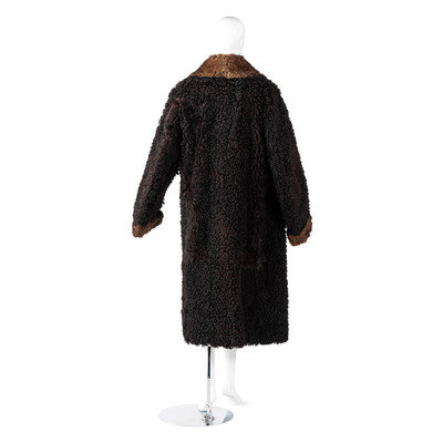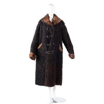 Chest 22 in., shoulders 19 in., sleeve length 28 in., overall length 52 1/2 in. Full-length commercially made buffalo coat with shawl collar and wooden toggles. Des Moines, IA: Monarch Tanning & Mfg. Co., n.d. Interior label. Quilted liner. One interior pocket and two outside pockets. Collar, exterior pockets, and cuffs feature contrasting fur. (Fur retains most of finish though front edges adjacent to quilt lining show loss and wear, some wear to interior quilt fabric and stitching, one missing toggle).