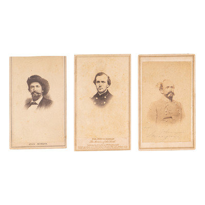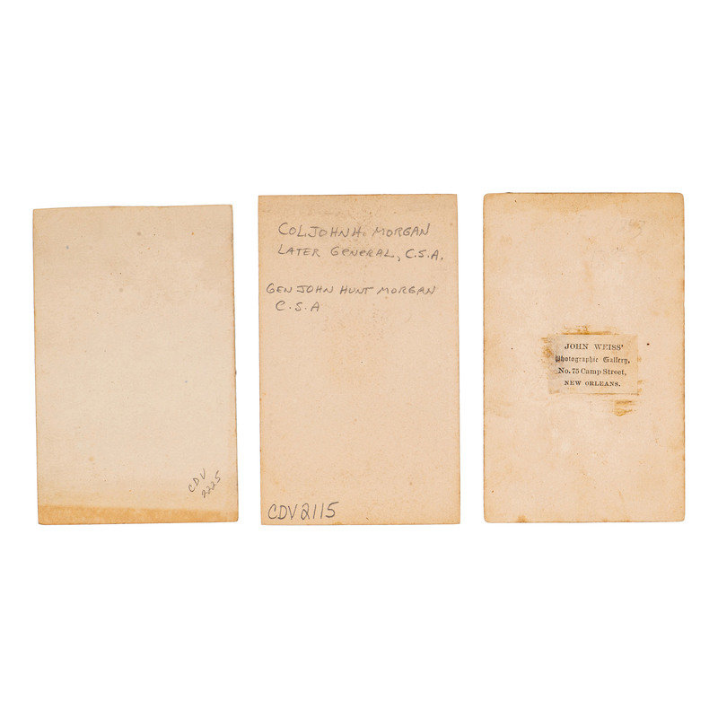 Vignetted bust portrait of Morgan in uniform as brigadier general. New Orleans: John Weiss' Photographic Gallery, n.d., [ca 1862-1864]. (Toning, spotting, light ripping/loss to image to left of subject's head and around subject's arm). Pencil identification on image, photographer's imprint on paper label affixed to verso. -- Vignetted bust portrait of a young Morgan wearing a dark double-breasted frock coat with shoulder straps. New York: E. Anthony, 1862. (Light toning, heavy spotting throughout). captioned "Col. John H. Morgan / The Marion of the South" on mount recto. Copyright information printed on mount recto, modern penciled identification on verso. -- Vignetted bust engraving of Morgan wearing a wide-brimmed hat and full mustache and goatee. N.p.: n.p, n.d. (Light spotting and soiling, with few punctures to image and clipped upper edge). Identified in print on mount recto, "John Morgan." -- Together, 3 cartes de visite, each approx. 2 1/8 x 3 1/2 in. or smaller, on cardstock mounts.