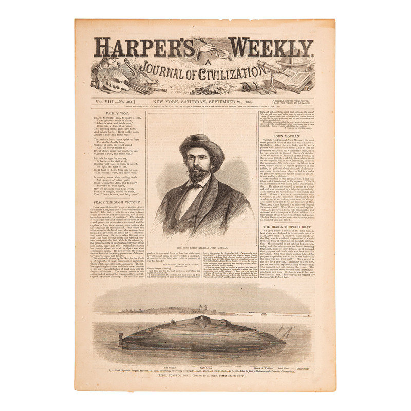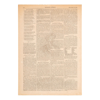 [With:] Harper's Weekly. Vol. VIII, No. 404. New York, 24 September 1864. 11 x 15 3/4 in., 2pp. Disbound (scattered spotting, wear to edges and corners; front page only included).