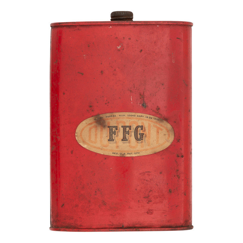 4 x 6 in. tin can (surface wear, soiling, retains majority of paint). Applied paper label on front with illustration of Native American armed with rifle; "Dupont" applied paper label on reverse (some soiling, wear to labels, few chips to edges).