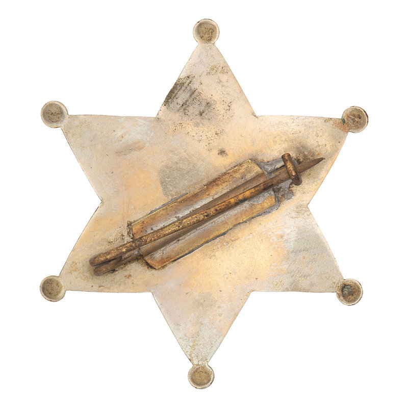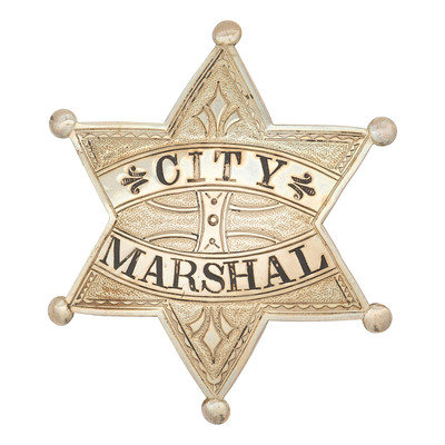2 1/4 in. across points, white metal badge (occasional loss of tarnish, light surface scratches). Comprised of 6-point ball star engraved "City Marshal."