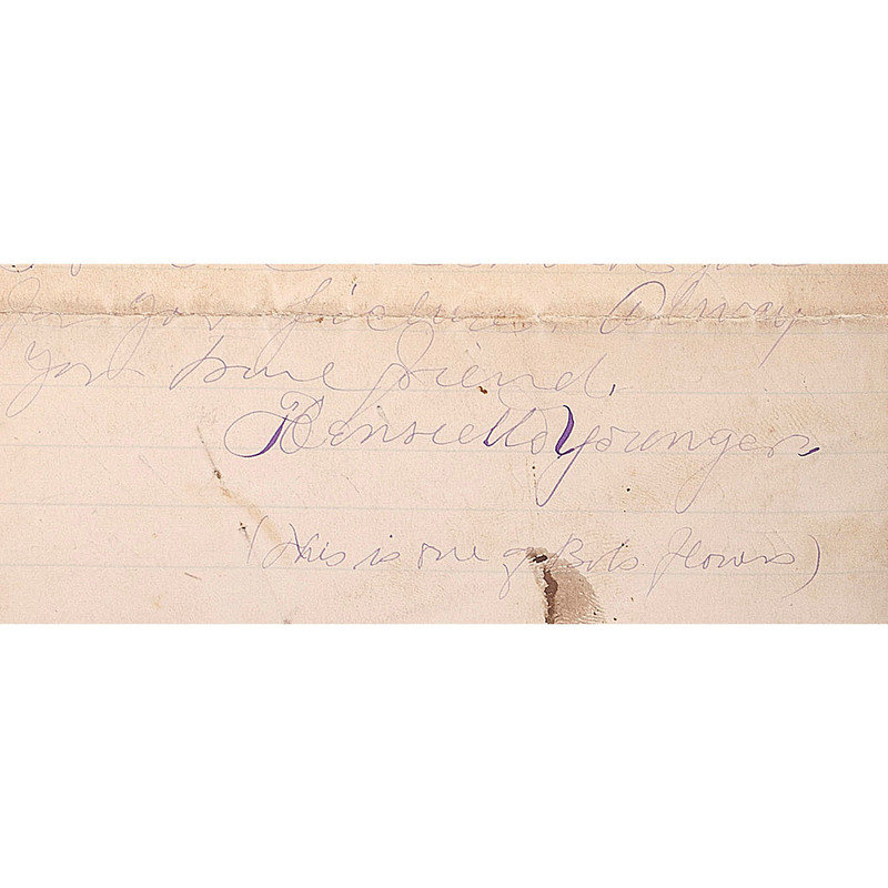 A letter in which Younger relates that a picture was received and that she will give it to her brother personally rather than leave it at his house because his wife probably won't understand. The recipient, Miss Louie, apparently is an actress, but the circumstances surrounding this meeting are unclear.