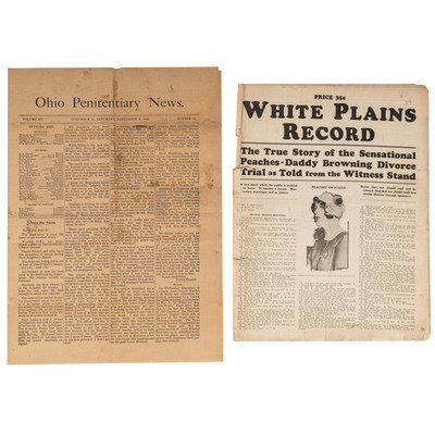 [With:] Ohio Penitentiary News. Vol. III, No. 22. Columbus, OH: 26 September 1896. 4pp. folio. The last page appears to be devoted to the Chapel Department. Other news includes items such as London police finding a “nest” of bombs – “dynamite eggs,” intended to blow the Queen of England (would have been Victoria at the time) to the moon (from Scotland) (p.2). -- 2 1/4 x 5 1/2 in. printed card for the Ohio Penitentiary, compliments of Ward Bros, Steamship & Tourist Ticket Agents. -- White Plains Record: The True Story of the sensational Peaches-Daddy Browning Divorce Trial as Told from the Witness Stand. [Ca 1927]. 14pp. “It teaches a lesson. Mercenary marriages end in misery.” Married at the age of 15 (with her parents’ permission) to Edward Browning, age 51, merely six months later Frances Heenan Browning attempted to have the union annulled claiming cruelty and bizarre behavior on the part of her husband. It was a case that entered popular culture of the day, earning references in various songs and other aspects of culture. It has been used in journalism texts as an example of the excesses of tabloid news of the day. -- Notebook, top opening. Front with “Charleston Police Department” in gilt, Charleston, WV. Inside front cover “R.C. West.” Pages with “Additional Details of Offence, Witnesses, etc.” at top. All blank.