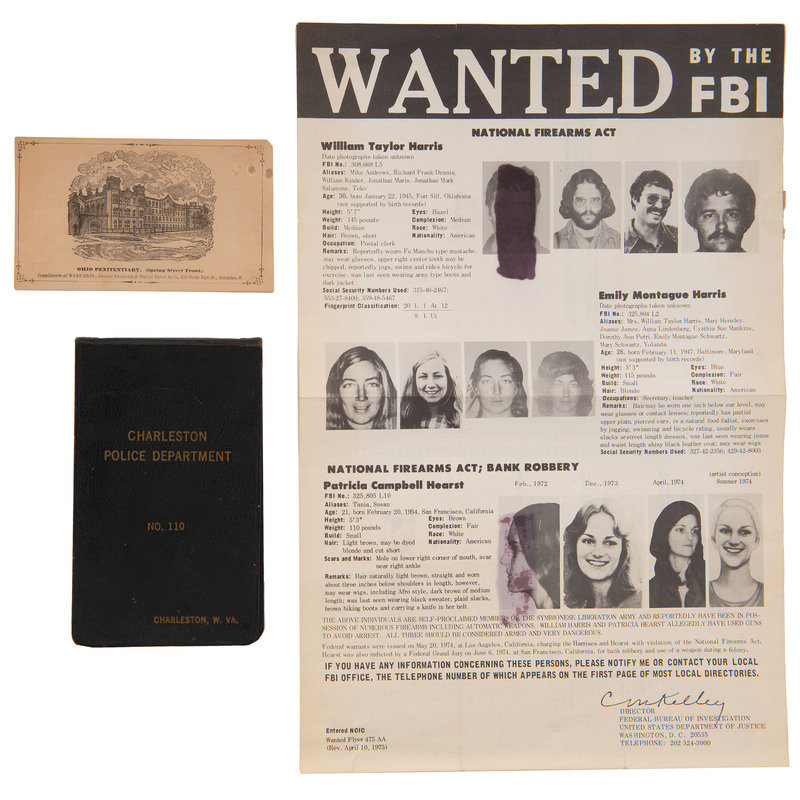 [CRIME AND PUNISHMENT]. A group of 5 items related to law enforcement, including Patty Hearst FBI wanted poster.