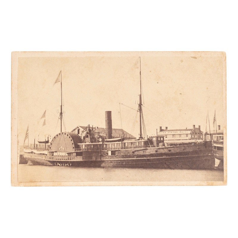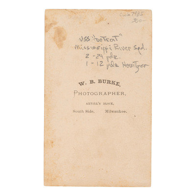 3 3/4 x 2 1/4 in. CDV on cardstock mount featuring the USS Detroit (toning, light surface soiling, and light wear to mount edges and corners). Photographer's imprint on verso along with modern pencil inscriptions identifying the sloop, her artillery, etc. The "United States Hotel" is visible in the background of the image.