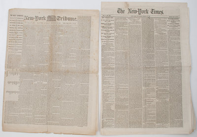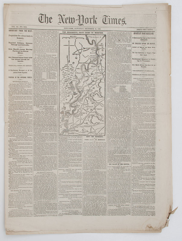 The New York Times. Vol. X, No. 2968. New York: N.p., 27 March 1861. 8pp. Column 6 states what many tried to deny: "Slavery the Basis of the New Confederacy," although many maintained it was about "states' rights," not slavery. With additional reporting on the South Carolina State Convention and the situation in Texas. -- The Dollar Newspaper. Vol XIX, No. 30. Philadelphia: N.p., 24 July 1861. Folio, 4pp. The first page contains a novelette, but the second page covers the United States' defeat at Manassas. -- New-York Tribune. Vol. XXI, No. 1053. New York: N.p.,16 November 1861. Folio, 8pp. Map of Beaufort, SC on p. 2. -- The New York Times. Vol. XI, No. 3192. New York: N.p., 14 December 1861. Folio, 8pp. Front with map of "The Mississippi, From Cairo to Memphis." Below is an article "Down the Mississippi." Focus on troops pouring into Kentucky, in preparation for a large battle. Inner pages with other war news. -- Together, 4 newspapers, folio, disbound, condition generally good, some toning especially at creases